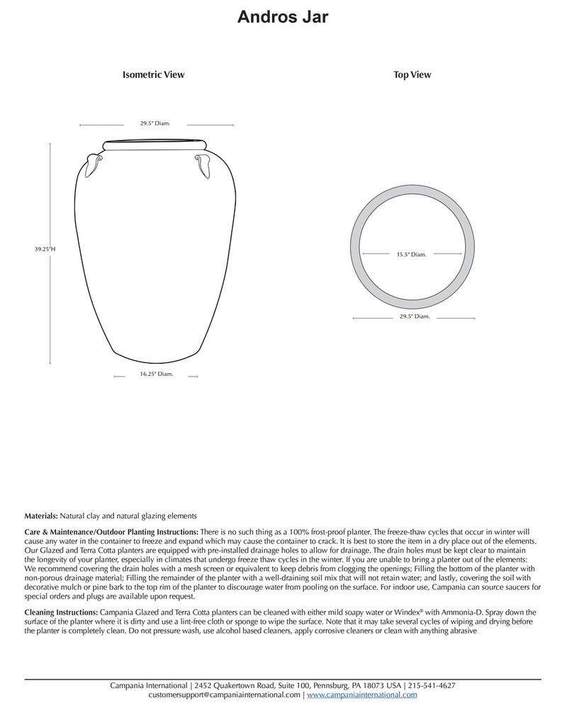 Campania’s glazed and terra cotta planters are hand made from natural clay using traditional artisanal techniques and high-fired at temperatures between 990-1000 degrees centigrade to ensure frost resistance and durability. Glazed planters are coated with natural glazing elements that are baked onto the surface to enhance the products resistance to weathering.