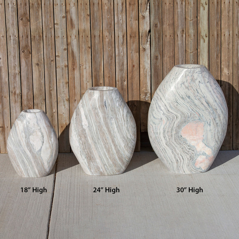 The graceful cascade of water over the gentle curves of this fountain creates a sense of calm and flow. Made of rare green marble, it is handcrafted by skilled artisans to an almond shape and designed to be self-contained. Its unique form evokes a sense of serenity and is beautiful without the hassle of complicated maintenance. Due to the inherent properties of stone, no two pieces are exactly alike. To ensure a cohesive and finished look, black polished pebbles are included with purchase. To meet spatial requirements, this fountain is available in three sizes.