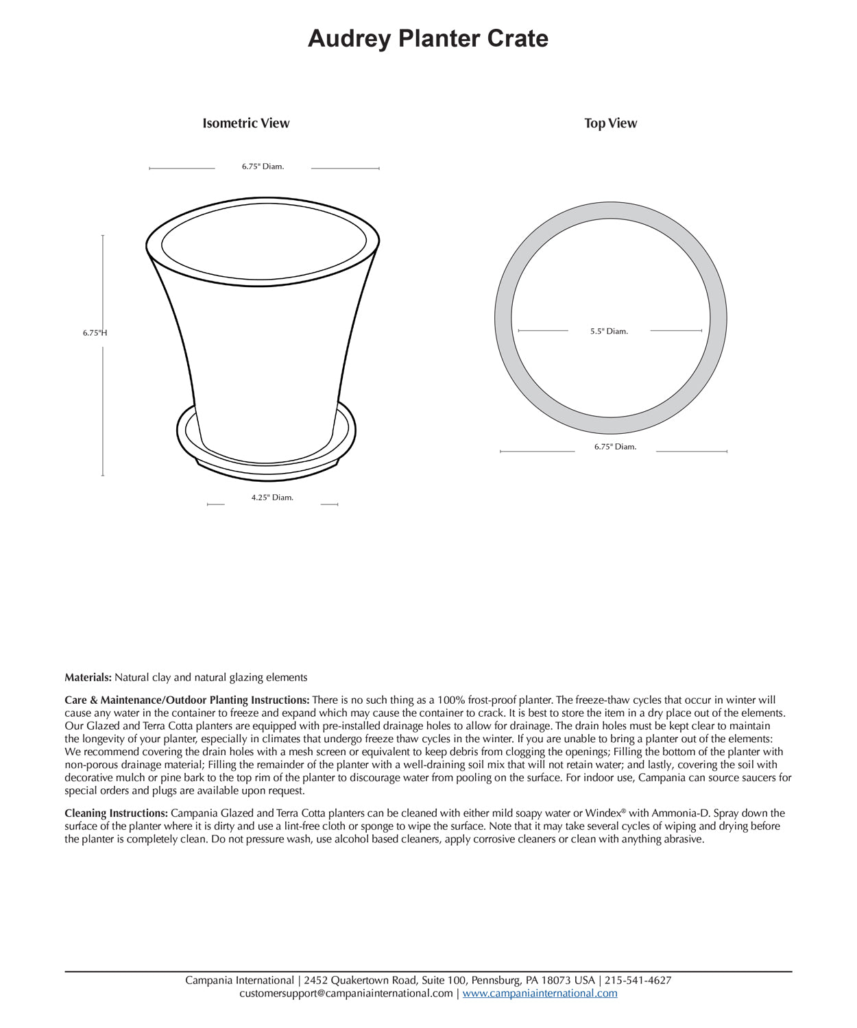 Cleaning Instructions: Campania Glazed and Terra Cotta planters can be cleaned with either mild soapy water or Windex® with Ammonia-D. Spray down the surface of the planter where it is dirty and use a lint-free cloth or sponge to wipe the surface. Note that it may take several cycles of wiping and drying before the planter is completely clean. Do not pressure wash, use alcohol based cleaners, apply corrosive cleaners or clean with anything abrasive.