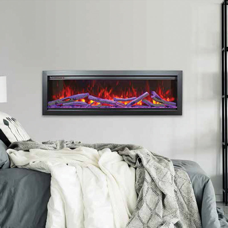 Unleash the panoramic allure of fire with the Amantii 50" Symmetry Smart Electric Fireplace (15-5/8"H x 50-1/4"W x 5-1/2"D), where modern elegance meets boundless control.** This indoor/outdoor marvel boasts a captivating 13-1/8"H x 48-1/2"W glass view, showcasing vibrant flames that dance in shades of yellow, orange, and red at your command. Effortless control is yours: choose from three flame speeds, two patterns, and 11 canopy/ember bed lighting colors to personalize your firelight. Warmth surrounds you with up to 5000 BTU, managed seamlessly via the WiFi app, touch pad, or patented thermostatic remote. Program the timer and thermostat to welcome you home with warmth or adjust automatically to the weather. Fully recessed or semi-flush mount options let you integrate this fireplace seamlessly into your space (SYM-XS surround required for semi-flush). No unsightly venting or grills intrude, just pure fire elegance. This Symmetry 50" isn't just a fireplace, it's a canvas for your firelight dreams, brought to life indoors or out.