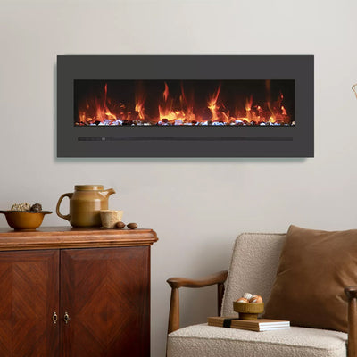 Behold the Sierra Flame 60" Linear Electric Fireplace (9 1/4"L x 6 1/8"W x 19 7/8"H), where panoramic fire meets modern elegance. This breathtaking 10"H x 57.5"W masterpiece seamlessly integrates into any space, flush-mounted or wall-mounted via included brackets. Mesmerizing flames dance at your command: state-of-the-art technology paints the firebox in vibrant hues of yellow, orange, and red with a simple click. Embrace the warmth: up to 5000 BTU of heat flows discreetly from the charcoal metallic steel surround, warming up to 500 square feet and operating independently of the flames. Control from anywhere: use the intuitive touchpad with temperature display or included remote to personalize your experience. Add your own twist: 13 customizable back-lighting colors illuminate the surround, creating a vibrant backdrop for your fire dreams. This Sierra Flame isn't just a fireplace, it's an artistic canvas for firelight, ready to ignite endless possibilities in any modern haven.