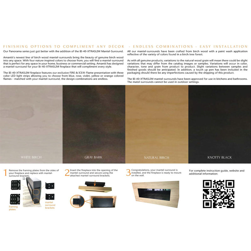 • NOTE: Amantii offers handcrafted birchwood mantel-surrounds in four nature-inspired colors, perfectly complementing your Bi40-XTRASLIM fireplace indoors (kitchens and bathrooms okay!), with slight variations in color and grain celebrating the natural beauty of wood. SOLD SEPARATELY