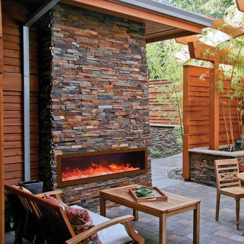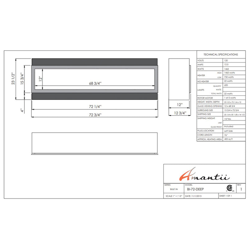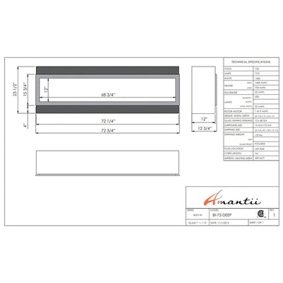 Command the elements with the Amantii Panorama 72" Deep Full View Smart Electric Fireplace (23.625"H x 72.125"W x 12"D), where panoramic fire meets effortless control. Imagine lifelike flames dancing across a 11.875" x 68.75" canvas, captivating your space with their undeniable grandeur. Customize your comfort: choose from three flame speeds, three color combinations, and 10 ambient canopy light colors to illuminate your media from above and below. Warmth surrounds you with 4800 BTU, controlled seamlessly through the WiFi app, touch pad, or remote. No unsightly venting or grills interrupt the view, just pure fire elegance. Program the timer and thermostat to welcome you home with warmth or adjust automatically to the weather. Durable and versatile, the Amantii Panorama 72" Deep transcends the ordinary, transforming any space into a haven of endless firelight possibilities. Embrace the future of fire, embrace the Amantii Panorama 72" Deep.