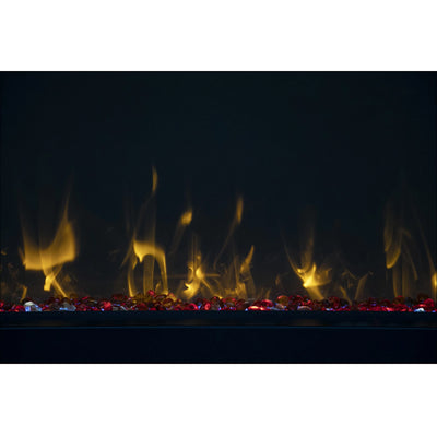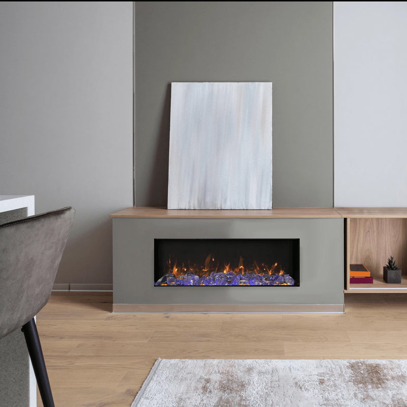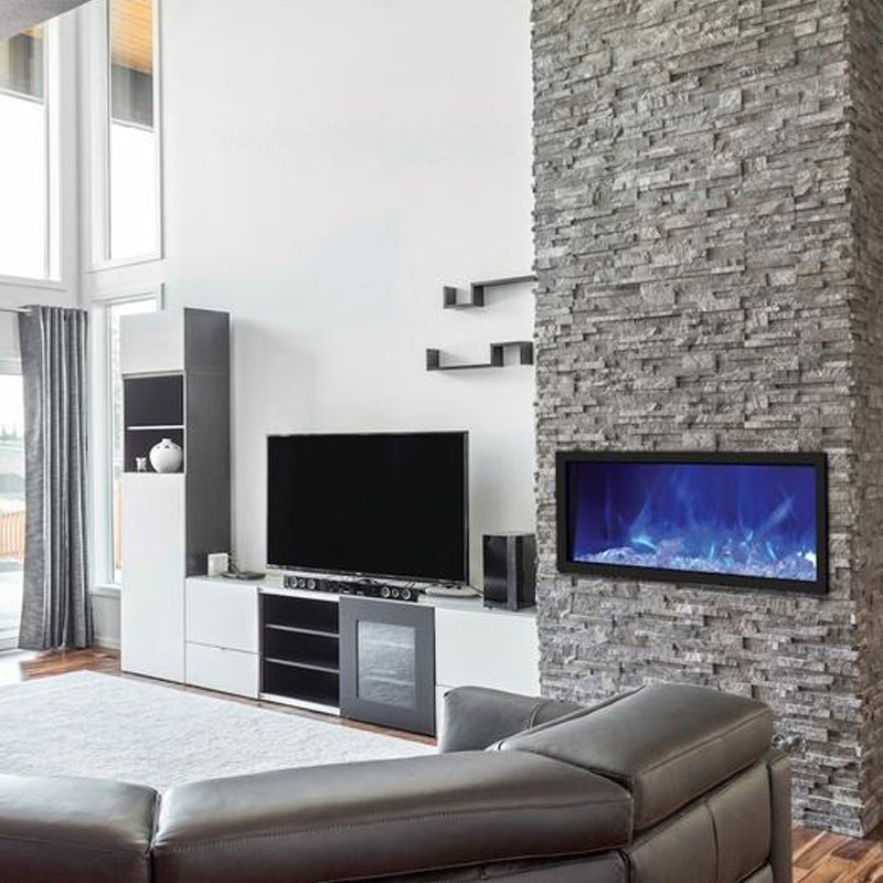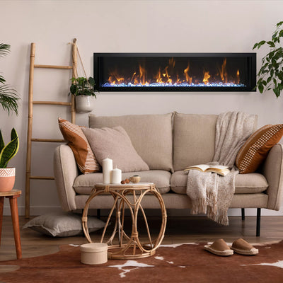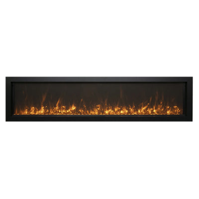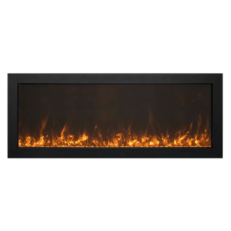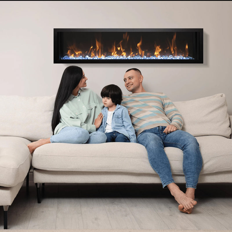 Transform your space with the Amantii Panorama BI 40" Slim Smart Electric Fireplace (23.625"H x 38.625"W x 6.75"D), where panoramic fire meets seamless control indoors or outdoors (cover required for outdoor use). Immerse yourself in lifelike flames: vibrant Fire & Ice® technology lets you switch from blue, purple, violet, orange, or yellow with a remote click. Control it all from anywhere: use the WiFi app to turn it on before you arrive or set it to adjust to the weather. Stay warm and cozy: up to 4800 BTU heat covers up to 500 sq. ft., with two heat stages and hardwire options. Customize your style: choose a "clean face" finish or use the included black steel surround. Full frame viewing lets your chosen material shine. This versatile masterpiece offers endless possibilities, blending modern technology with the timeless allure of fire. Embrace the Panorama BI 40" Slim and ignite your vision.