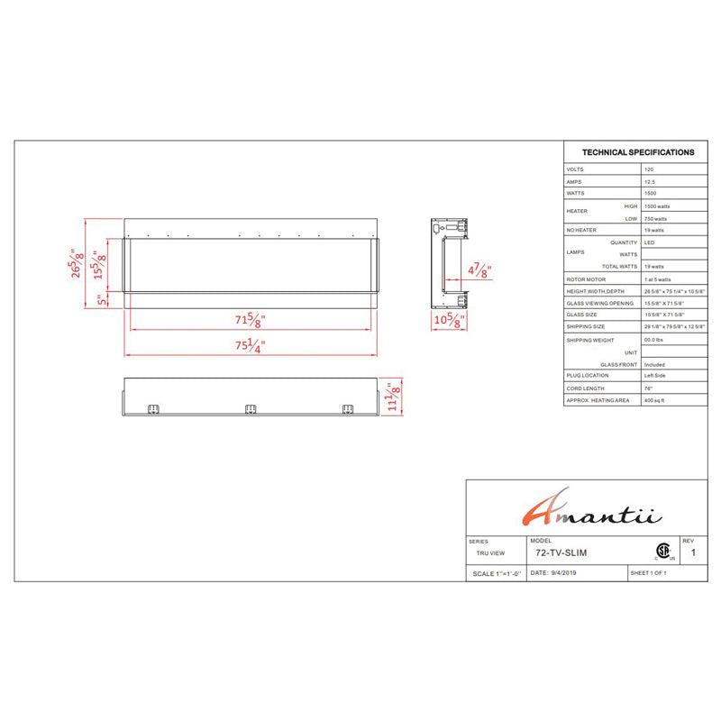 Behold the panoramic grandeur of the Amantii True View 72" Slim Smart Electric Fireplace (26.625"H x 75.25"W), where boundless flames meet seamless control.** This ultra-thin, 4" deep masterpiece isn't just a fireplace; it's a window to a captivating vista (15.58"H x 71.58"W viewing area) of lifelike fire dancing across a 72-inch canvas. Immerse yourself in warmth: 5000 BTU heat envelops your space, controlled effortlessly through the WiFi app, touch pad, or patented thermostatic remote. Customize the ambiance: choose from three flame speeds, three color combinations, and 10 ember lighting options, even in a rotating color setting. Unleash the magic of technology: program the timer and thermostat to welcome you home with warmth or adjust automatically to the weather. No unsightly venting or grills mar the view, just pure, clean fire beauty. Durable and versatile, the Amantii True View 72" Slim Smart transcends the ordinary, transforming any space into a haven of endless firelight possibilities.