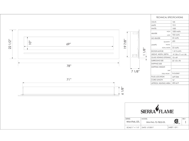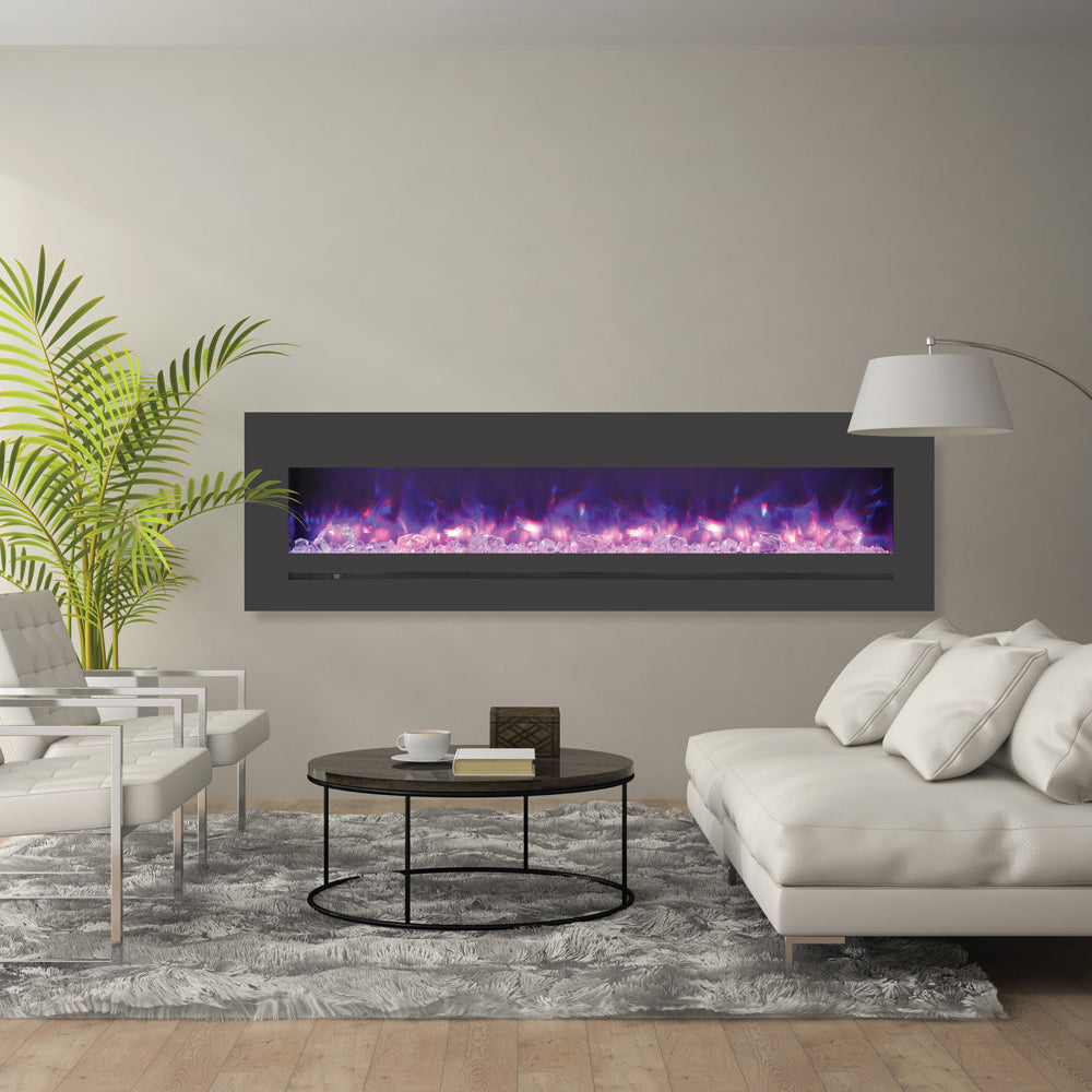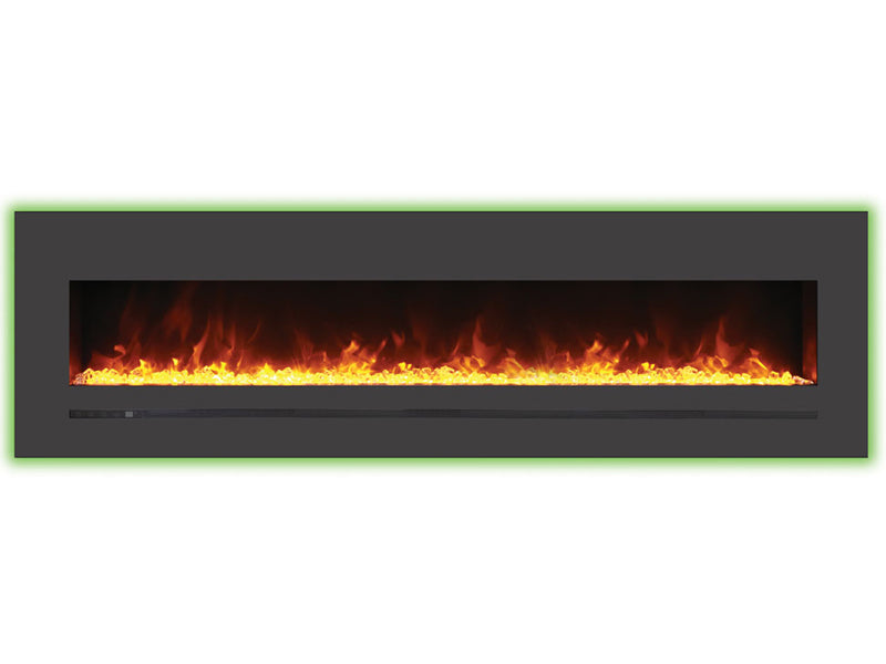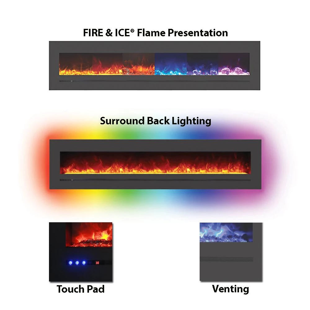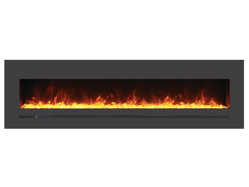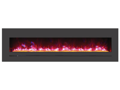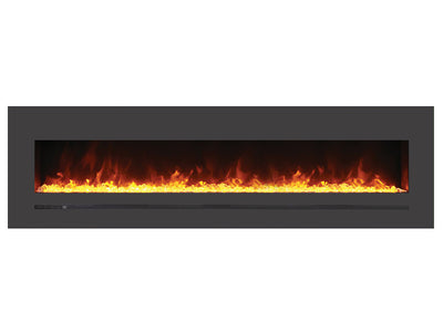 Command panoramic fire magic with the Sierra Flame 72" Linear Electric Fireplace (19 7/8"H x 71"W x 6 1/8“D), where modern lines meet vibrant flames. This sleek stunner boasts a captivating 10"H x 69"W glass view, showcasing mesmerizing flames that dance in shades of yellow, orange, and red at your command. Choose your canvas: seamlessly integrate it into any wall with included brackets for a flush mount or wall mount, maximizing space. Warmth on demand: enjoy up to 500 sq. ft. of heat, emitted from a discreet slot in the stove-bright charcoal metallic steel surround, with the option to operate heat and flame independently. Control is effortless: adjust temperature and flame color with the intuitive touch pad or included remote. Immerse yourself in ambiance: choose from 13 vibrant back-lighting colors to illuminate the surround and create personalized moods. This Sierra Flame isn't just a fireplace, it's a statement piece that ignites endless possibilities, indoors or out.