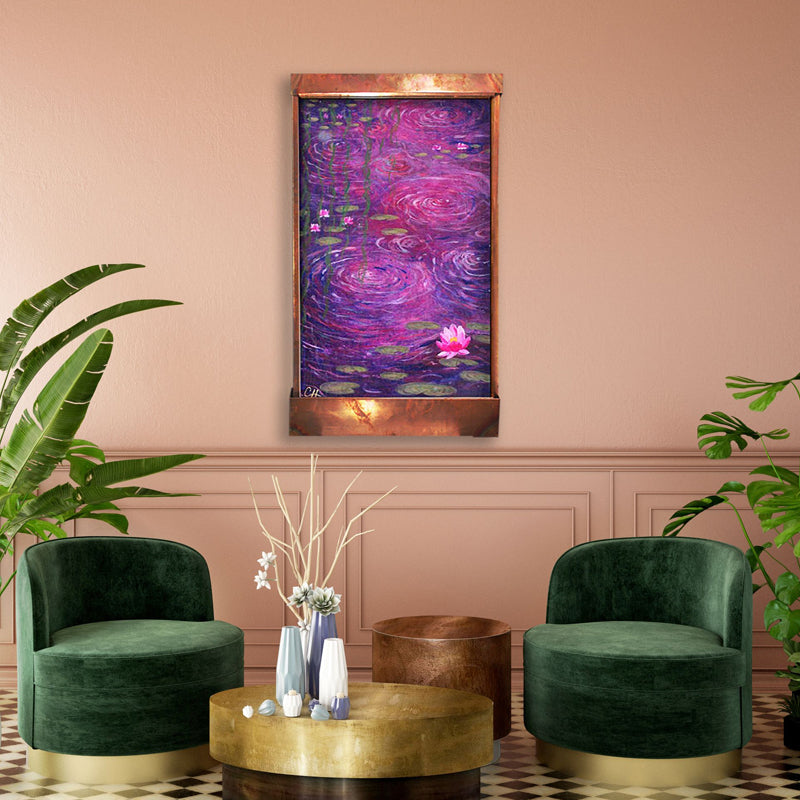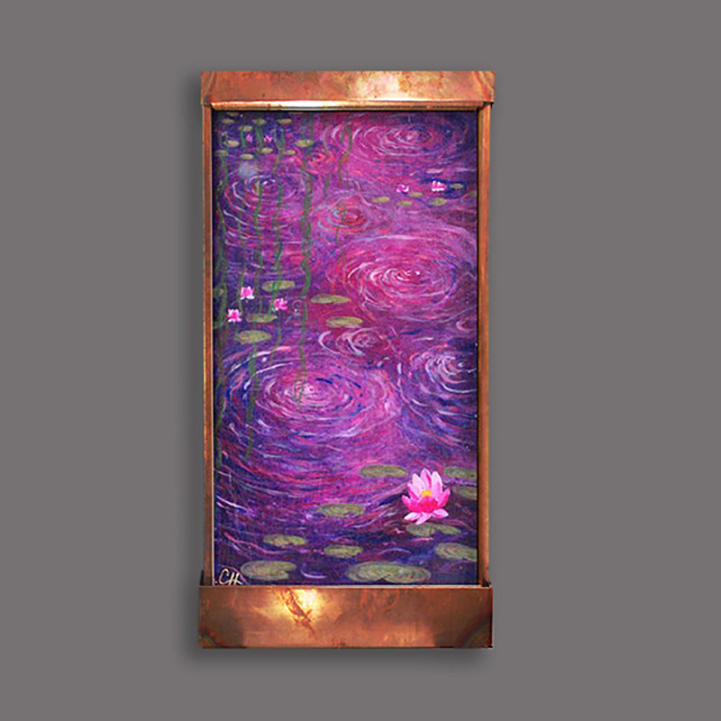 Hang this Fireflies Wall Fountain in your home or office for added ambiance and beauty. It features a magical look with lovely colors of water lilies and lilipads. This beautiful art wall fountain is hand painted on the back of a strong and high-tech clear acrylic panel. It is built for durability and is completely safe.