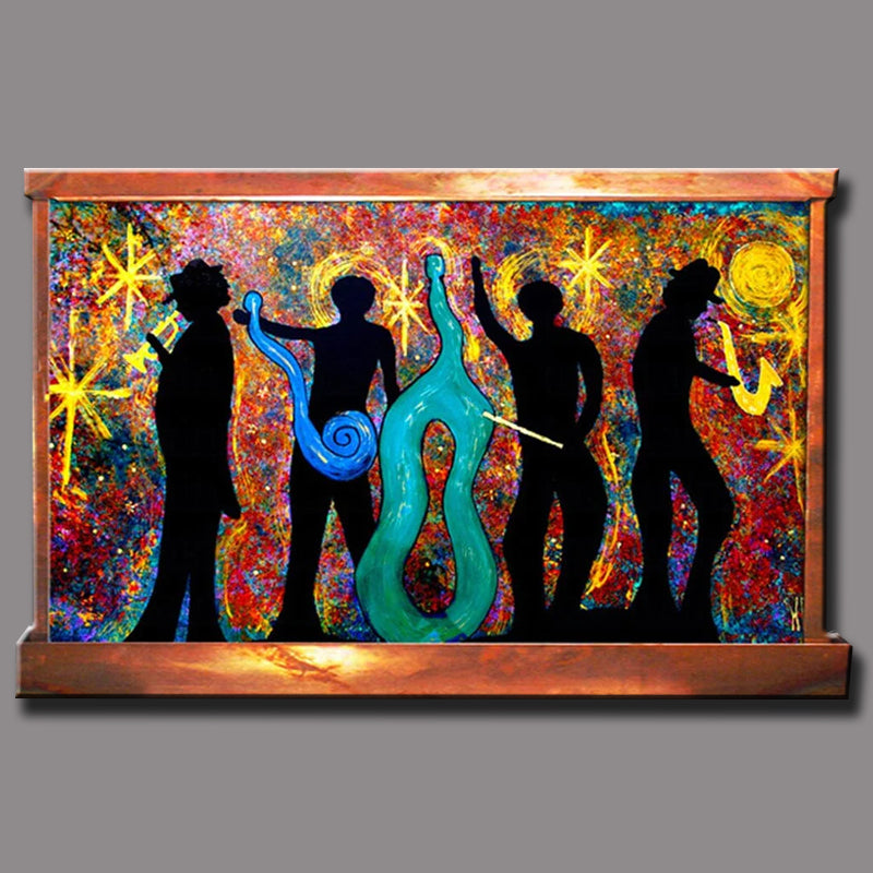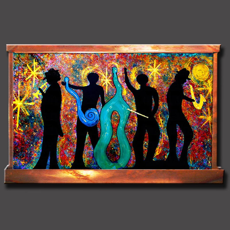 This Jamaica Farewell Wall Fountain is all about depicting the music and life in Jamaica. The image is hand painted onto the reverse side of the Lexan acrylic panel. The water flows down the face of it in a wonderful manner, like rain flowing down a window.