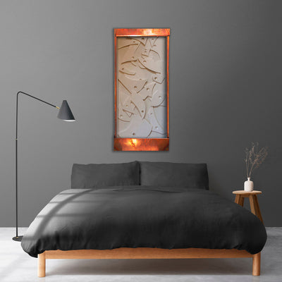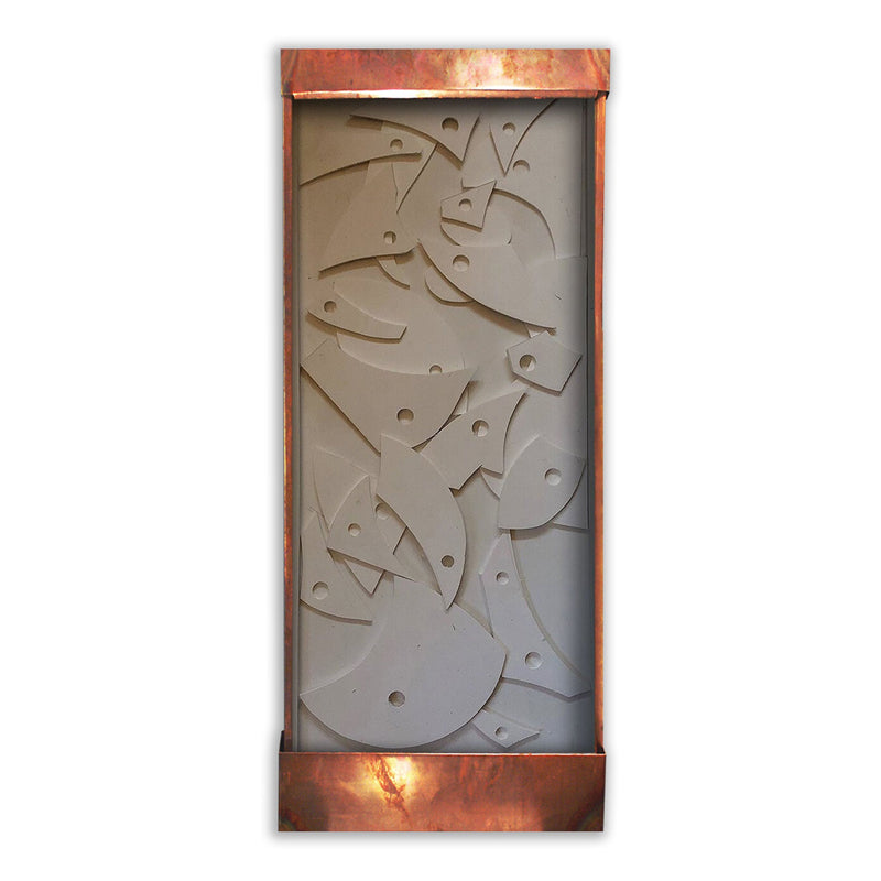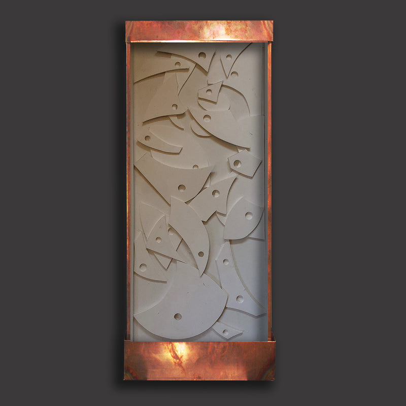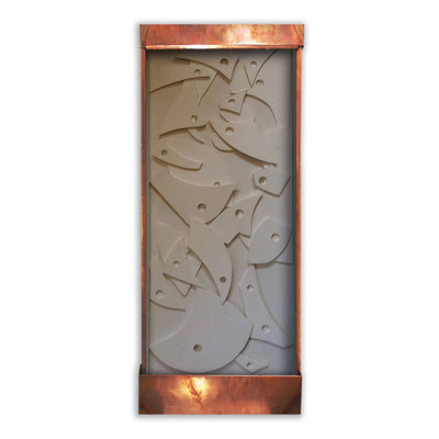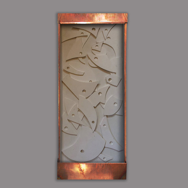 Katharos is something you've probably never seen before- a combination of a sculpture and a water feature. Its white on white abstract panels and pieces give it an ultra-modern appearance. Ordered with an optional LED light hood, you get a beautiful interplay of shadows that will have you seeing new things in this piece time and time again. While its dimensions are 48" tall, 22" wide, and 5" deep, we can make it to almost any size that you might need. It comes with a pump and all the hardware you'll need to hang it up.