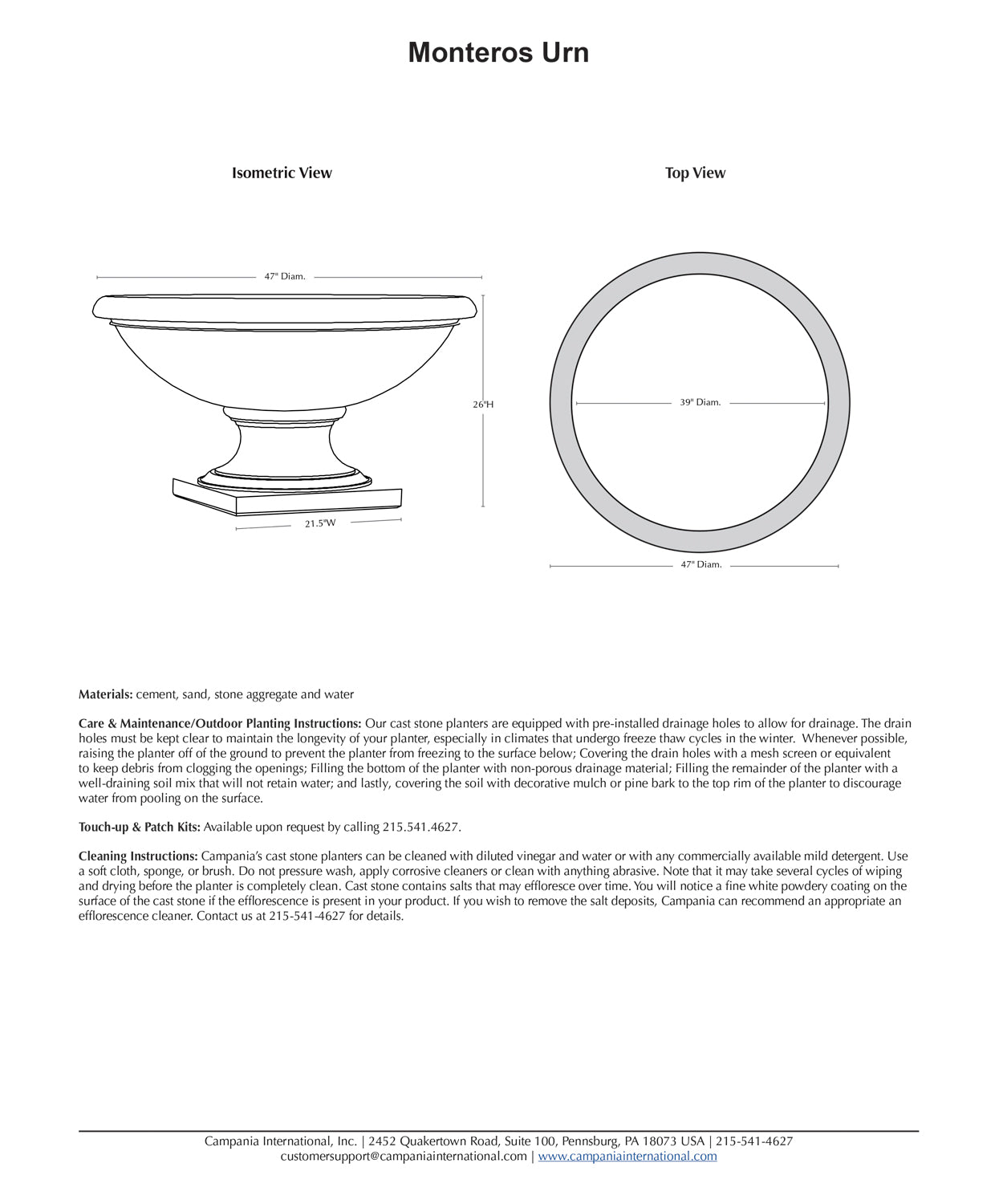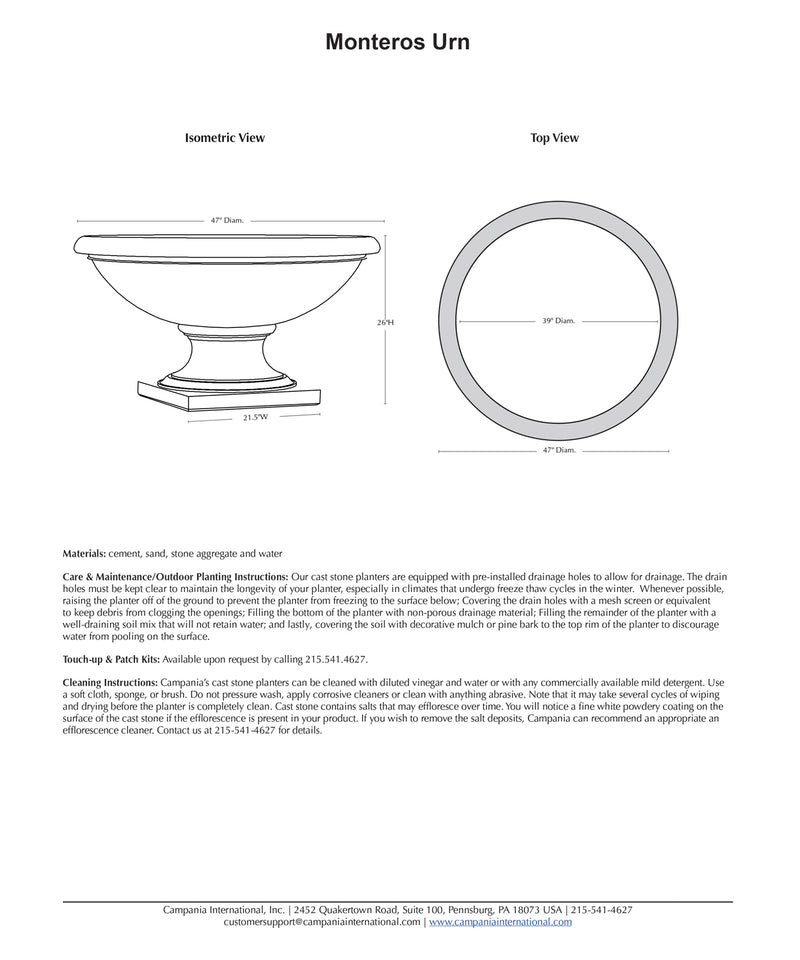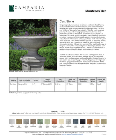 Campania proudly manufactures its cast stone products in the USA using locally sourced materials. All of our cast stone pieces are manufactured using the wet casting technique with a proprietary high density cast stone mix, yielding a PSI strength of approximately 7,500. The mix is comprised primarily of water, sand, stone aggregate and cement. Our cast stone products may qualify for LEED credits as applicable to your project. Cast stone produces a strong and durable product that will weather naturally in an outdoor environment. Simply stated, cast stone is chosen for its beauty and authenticity. Our material is natural, authentic, made in the USA, and 100% recyclable.