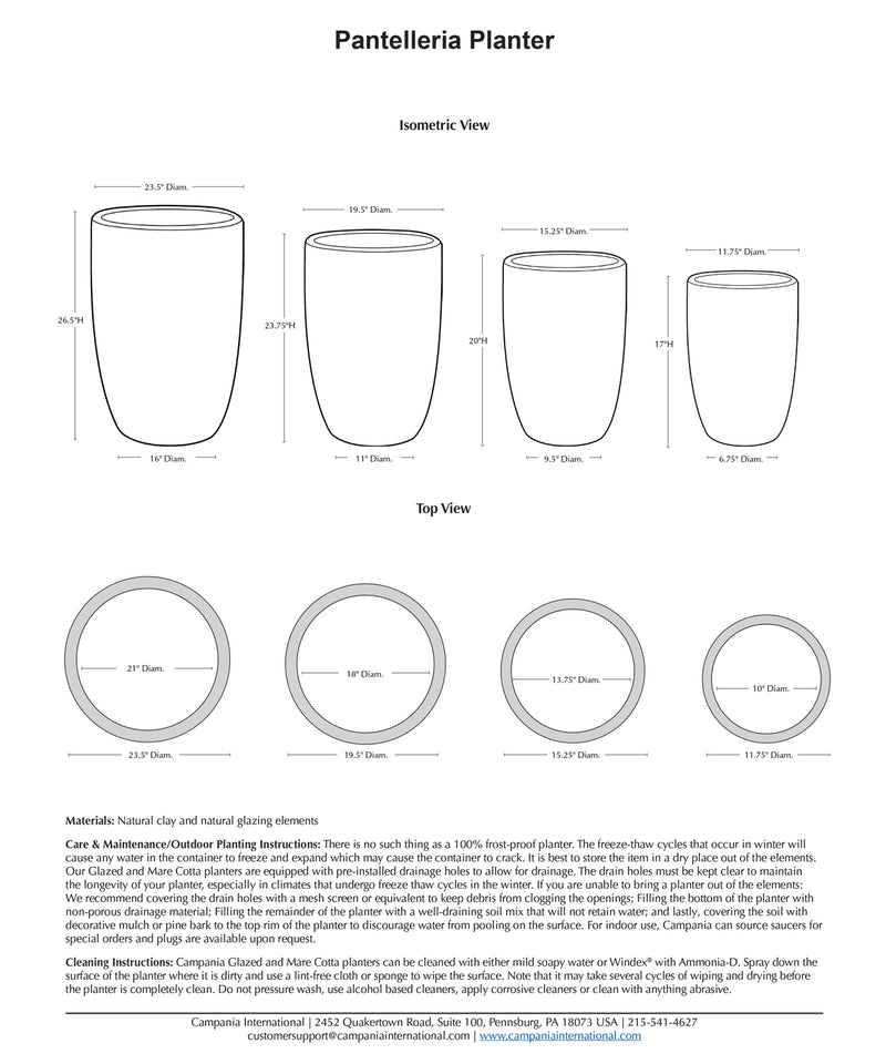 Cleaning Instructions: Campania Glazed and Terra Cotta planters can be cleaned with either mild soapy water or Windex® with Ammonia-D. Spray down the surface of the planter where it is dirty and use a lint-free cloth or sponge to wipe the surface. Note that it may take several cycles of wiping and drying before the planter is completely clean. Do not pressure wash, use alcohol based cleaners, apply corrosive cleaners or clean with anything abrasive.