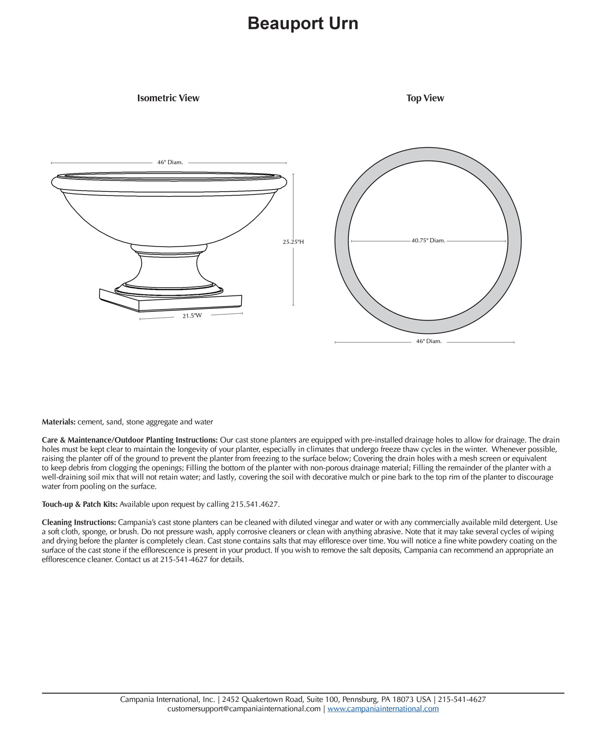 Campania proudly manufactures its cast stone products in the USA using locally sourced materials. All of our cast stone pieces are manufactured using the wet casting technique with a proprietary high density cast stone mix, yielding a PSI strength of approximately 7,500. The mix is comprised primarily of water, sand, stone aggregate and cement. Our cast stone products may qualify for LEED credits as applicable to your project. Cast stone produces a strong and durable product that will weather naturally in an outdoor environment. Simply stated, cast stone is chosen for its beauty and authenticity. Our material is natural, authentic, made in the USA, and 100% recyclable.