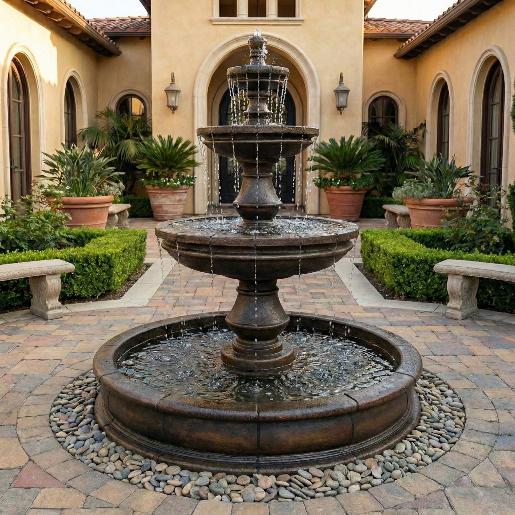The concrete fountain is actually crafted from durable fiberglass reinforced cast stone concrete and lined with a polyethylene tub for waterproofing purposes
