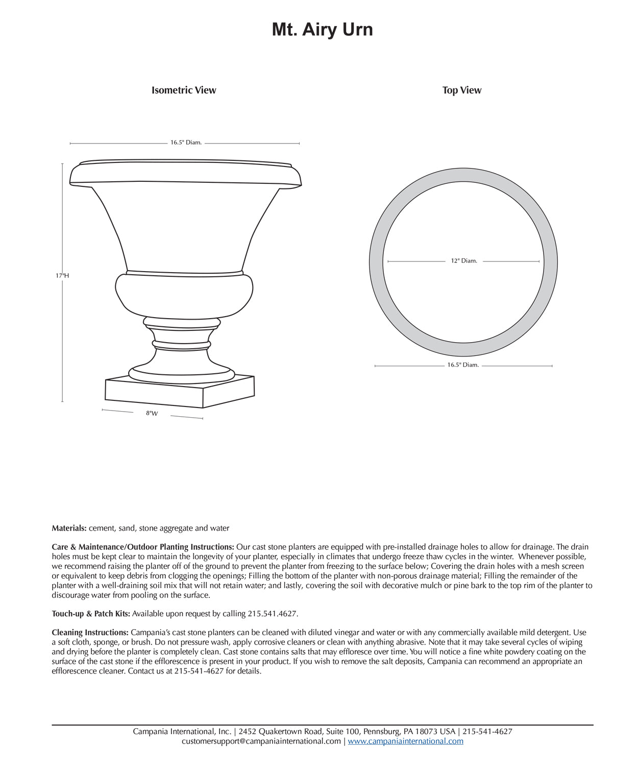 Campania proudly manufactures its cast stone products in the USA using locally sourced materials. All of our cast stone pieces are manufactured using the wet casting technique with a proprietary high density cast stone mix, yielding a PSI strength of approximately 7,500. The mix is comprised primarily of water, sand, stone aggregate and cement. Our cast stone products may qualify for LEED credits as applicable to your project. Cast stone produces a strong and durable product that will weather naturally in an outdoor environment. Simply stated, cast stone is chosen for its beauty and authenticity. Our material is natural, authentic, made in the USA, and 100% recyclable.