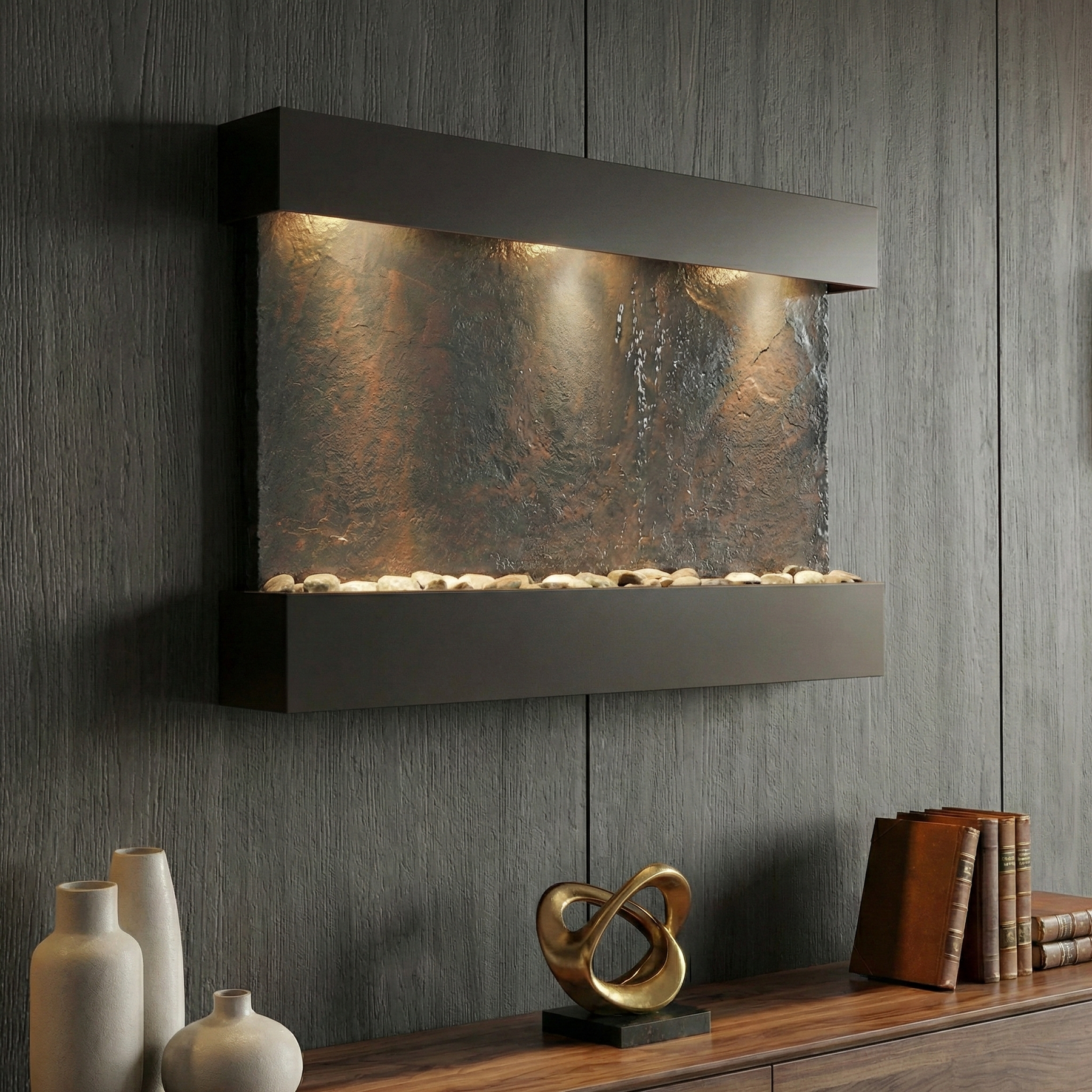 The Reflection Creek Wall Fountain is a horizontally oriented wall water feature with a sleek modern design that will enhance any room in your home or office. It is crafted of high-quality materials and leak-free.