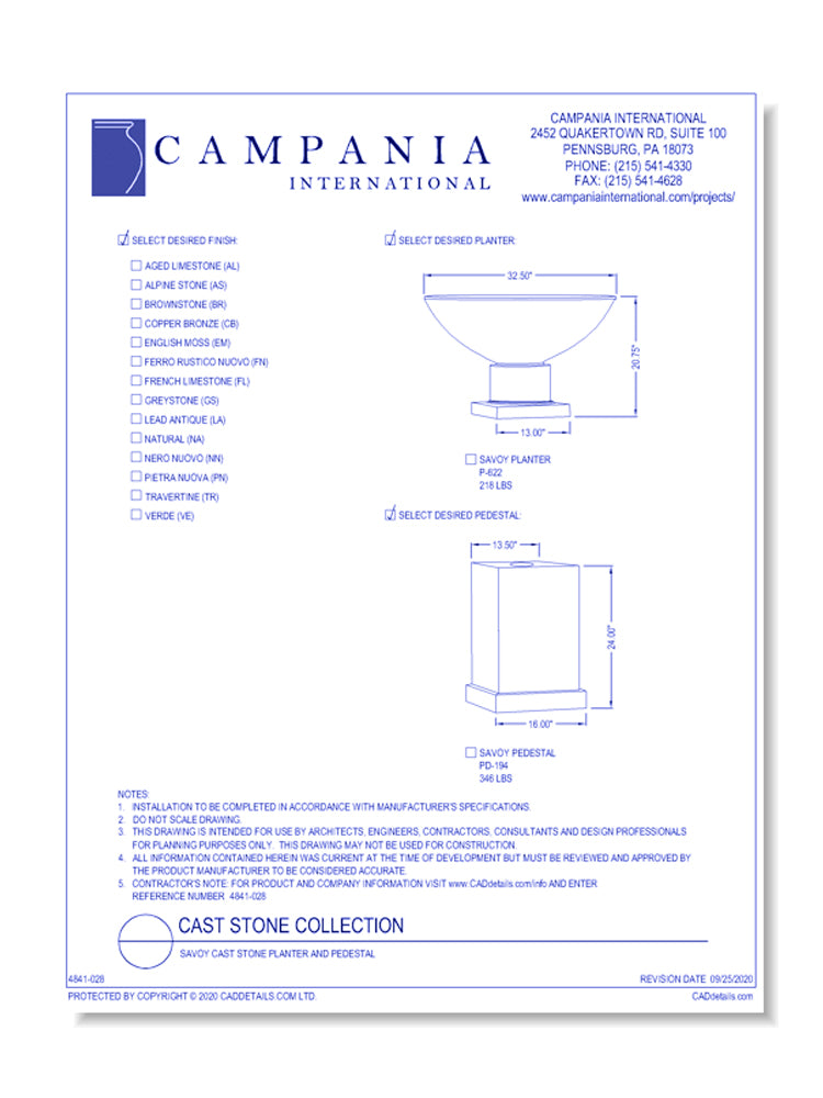 Campania proudly manufactures its cast stone products in the USA using locally sourced materials. All of our cast stone pieces are manufactured using the wet casting technique with a proprietary high density cast stone mix, yielding a PSI strength of approximately 7,500. The mix is comprised primarily of water, sand, stone aggregate and cement. Our cast stone products may qualify for LEED credits as applicable to your project. Cast stone produces a strong and durable product that will weather naturally in an outdoor environment. Simply stated, cast stone is chosen for its beauty and authenticity. Our material is natural, authentic, made in the USA, and 100% recyclable.
