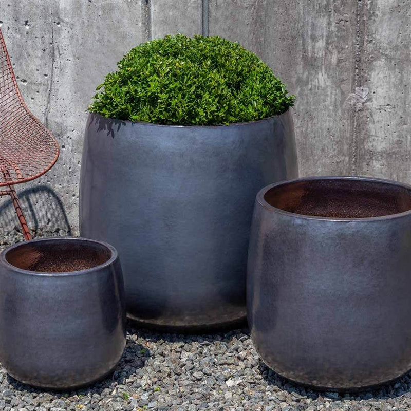 We recommend covering the drain holes with a mesh screen or equivalent to keep debris from clogging the openings; Filling the bottom of the planter with non-porous drainage material; Filling the remainder of the planter with a well-draining soil mix that will not retain water; and lastly, covering the soil with decorative mulch or pine bark to the top rim of the planter to discourage water from pooling on the surface. For indoor use, Campania can source saucers for special orders and plugs are available upon request.