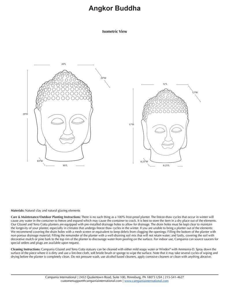 Cleaning Instructions: Campania Glazed and Terra Cotta statuary can be cleaned with either mild soapy water or Windex ® with Ammonia-D. Spray down the surface of the piece where it is dirty and use a lint-free cloth, soft bristle brush or sponge to wipe the surface. Note that it may take several cycles of wiping and drying before the planter is completely clean. Do not pressure wash, use alcohol based cleaners, apply corrosive cleaners or clean with anything abrasive.