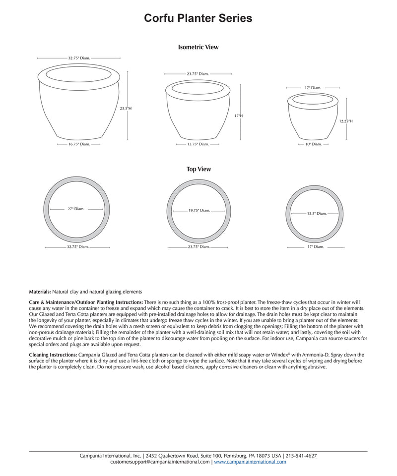 NOTE: Always place any Campania product on a solid level foundation and not directly on grass, soil, or an uneven surface. While our pottery is considered frost resistant, proper winter care is recommended for all Campania products for protection in environments with potential freeze-thaw cycles. If the product remains in contact with the ground surface over the winter, the freeze thaw cycles may it to crack or crumble.
