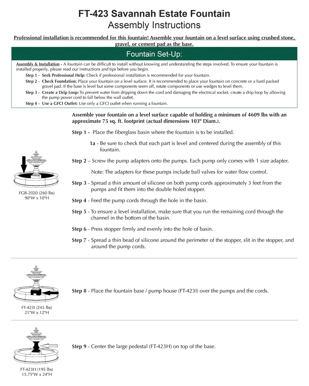 Note: Professional installation recommended for this fountain