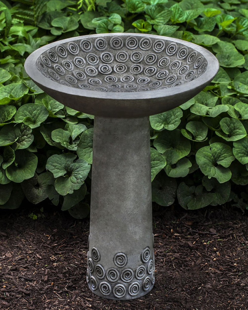 Cleaning Instructions: Campania’s cast stone birdbaths can be cleaned with diluted vinegar and water or with any commercially available mild detergent. Use a soft cloth, sponge, or brush. Do not pressure wash, apply corrosive cleaners or clean with anything abrasive. Note that it may take several cycles of wiping and drying before the birdbath is completely clean. Cast stone contains salts that may effloresce over time. You will notice a fine white powdery coating on the surface of the cast stone if the efflorescence is present in your product. If you wish to remove the salt deposits, Campania can recommend an appropriate an efflorescence cleaner.