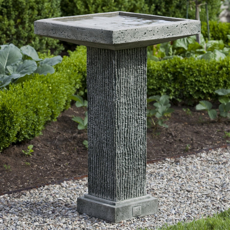 Cleaning Instructions: Campania’s cast stone birdbaths can be cleaned with diluted vinegar and water or with any commercially available mild detergent. Use a soft cloth, sponge, or brush. Do not pressure wash, apply corrosive cleaners or clean with anything abrasive. Note that it may take several cycles of wiping and drying before the birdbath is completely clean. Cast stone contains salts that may effloresce over time. You will notice a fine white powdery coating on the surface of the cast stone if the efflorescence is present in your product. If you wish to remove the salt deposits, Campania can recommend an appropriate an efflorescence cleaner.