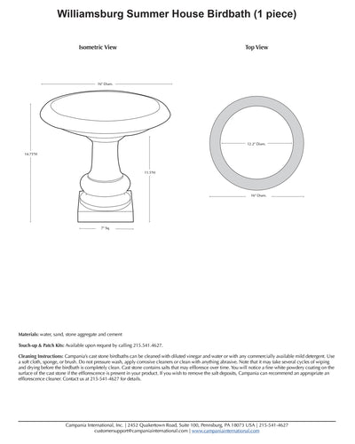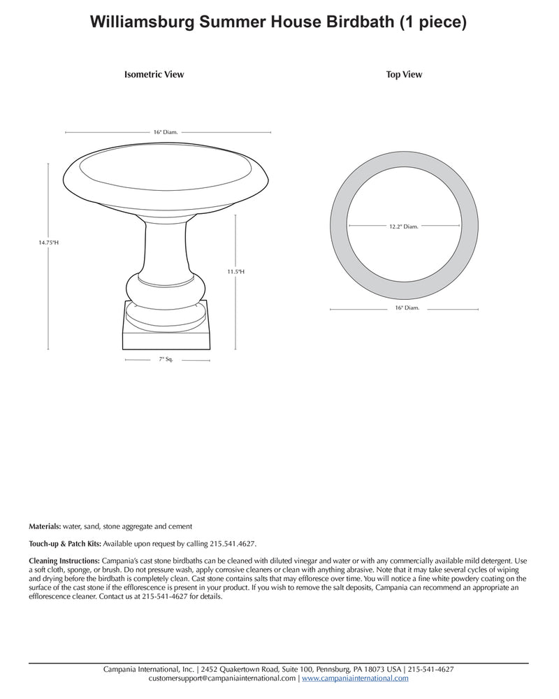 Cleaning Instructions: Campania’s cast stone birdbaths can be cleaned with diluted vinegar and water or with any commercially available mild detergent. Use a soft cloth, sponge, or brush. Do not pressure wash, apply corrosive cleaners or clean with anything abrasive. Note that it may take several cycles of wiping and drying before the birdbath is completely clean. Cast stone contains salts that may effloresce over time. You will notice a fine white powdery coating on the surface of the cast stone if the efflorescence is present in your product. If you wish to remove the salt deposits, Campania can recommend an appropriate an efflorescence cleaner.