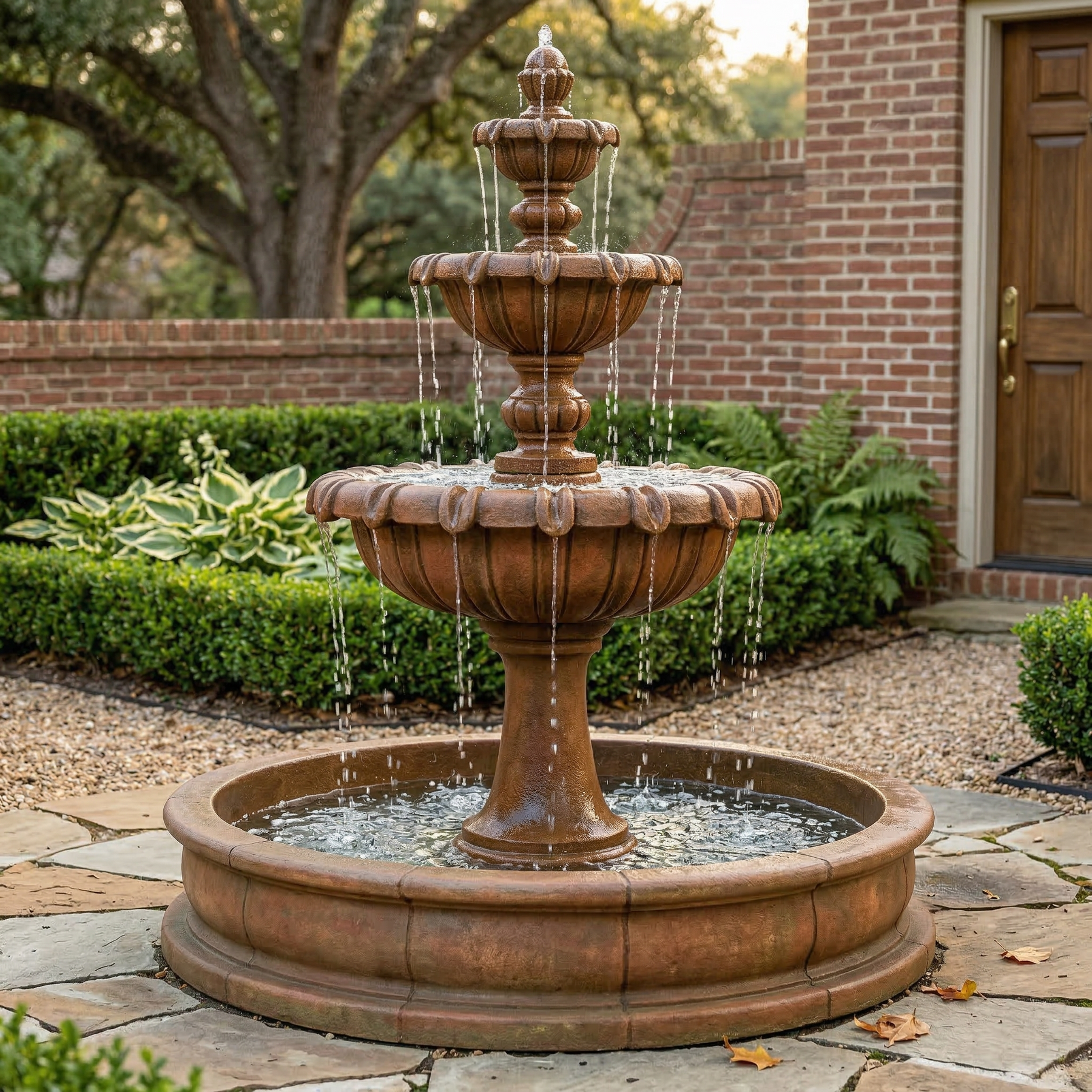 The Chateau Pond Outdoor Water Fountain is a spectacular work of art and an amazing addition to any garden setting. This stately water feature has three tiers with a wide round basin at the bottom.