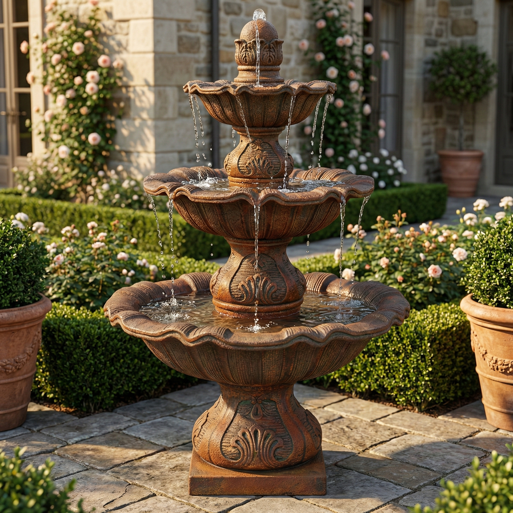 Add a unique and eye-catching accent to your garden setting with the Regina Three Tier Fountain. It features a ball-shaped finial cradled by leaves and intricately designed tiers and columns.