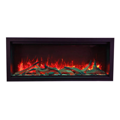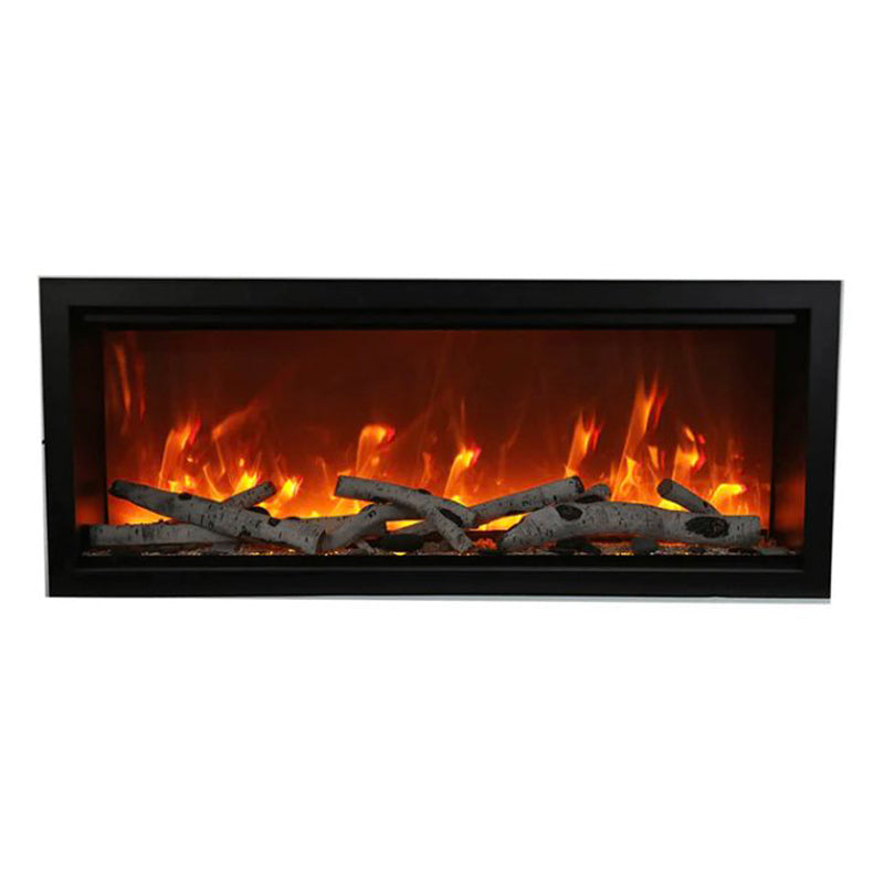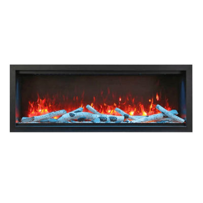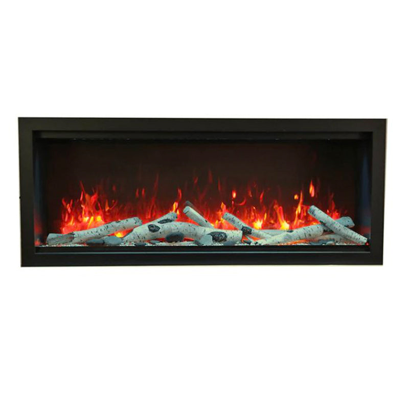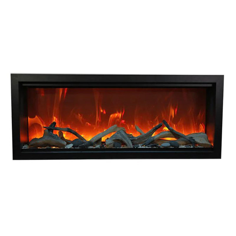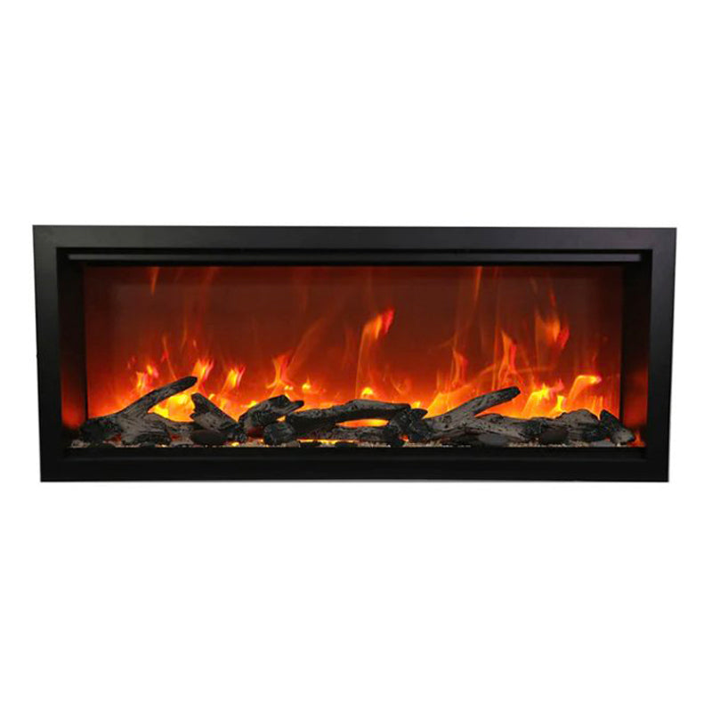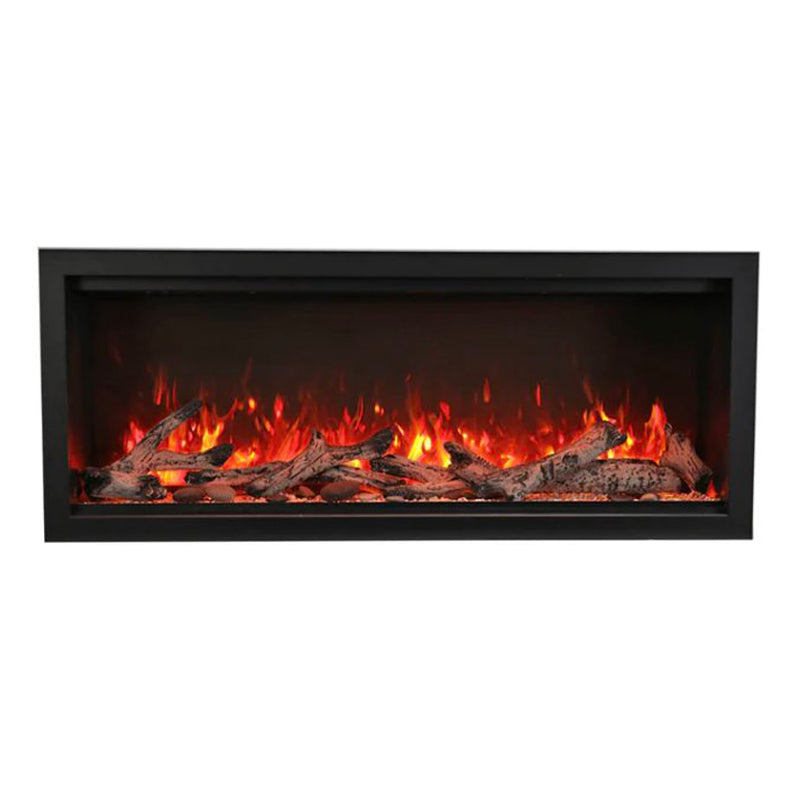 Embrace the grandeur of fire with the Amantii 42" Symmetry Extra Tall Smart Electric Fireplace (20 1/8"H x 42 1/4"W x 11 3/4”D), where elegance meets effortless control.** This indoor/outdoor masterpiece boasts an impressive 17 5/8" x 40 5/8″ glass viewing area, showcasing mesmerizing flames in shades of yellow, orange, and red at your command. No vents intrude on the view, just pure fireplace elegance. Control it all from the intuitive touchpad: adjust flame speed and colors, explore 13 vibrant canopy lighting options to illuminate your media, and choose between two flame patterns to personalize your haven. Warmth surrounds you with up to 5000 BTU, controlled seamlessly via remote, WiFi app, or the built-in thermostat. Installation flexibility: fully recess for a stunning look, utilize the included black surround for a classic touch, or opt for a custom surround (trim required). This Symmetry isn't just a fireplace, it's a statement piece that ignites endless possibilities, indoors or out.