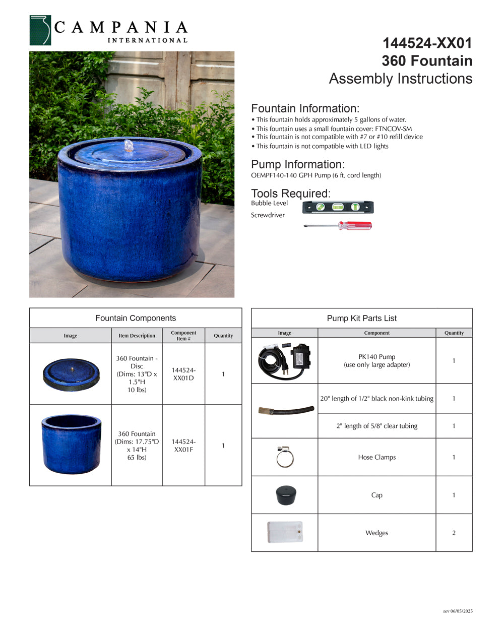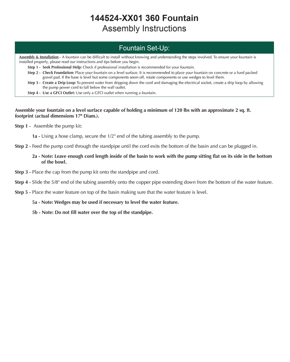 - All hardware and tubing required to properly assemble the fountain