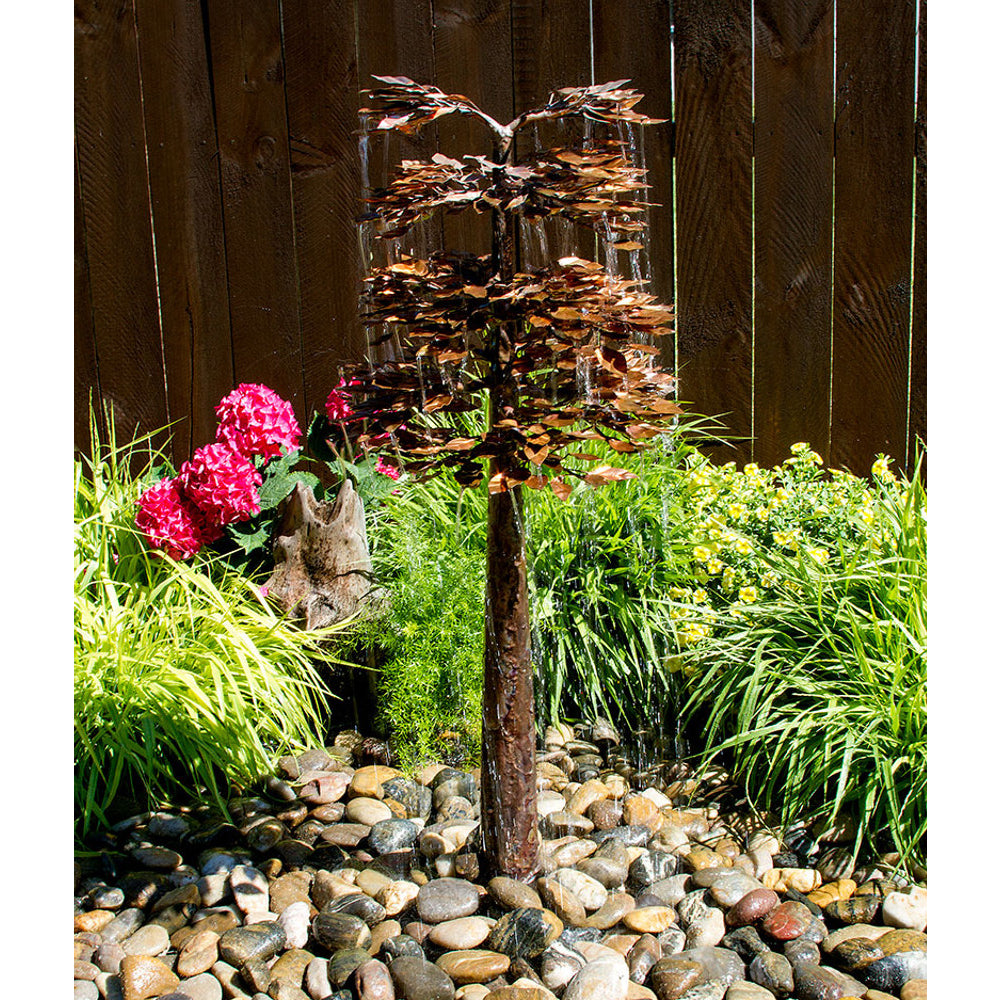 Standing at 40”, this fountain is crafted to evoke a Sequoia tree. The sculpted metal beautifully frames the fluid grace of the water. With each element, down to the last leaf, meticulously hand-cut and hand-made by our designer in the tranquil English woodlands, no two pieces are exactly identical. To ensure a long life and prevent maintenance issues, a stainless steel mesh pump bag is included to protect against clogging. Polished pebbles, which are not included, are available for purchase. We recommend a quantity of 200 lbs. for best results.