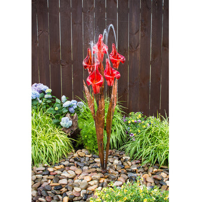 This stunning fountain celebrates the beautiful interplay of metal and water. It is thoughtfully designed to look like a cluster of red irises, and is a striking addition that complements a wide range of landscape designs. Each piece, from the main structure to the delicate leaves, is hand-cut and hand-made by our designer in the most serene part of the deep English woodlands. The individuality of each of our 50" Copper Red Iris Flower Garden Fountain is guaranteed. Polished pebbles, which are not included, are available for purchase. We recommend a quantity of 200 lbs. for best results.