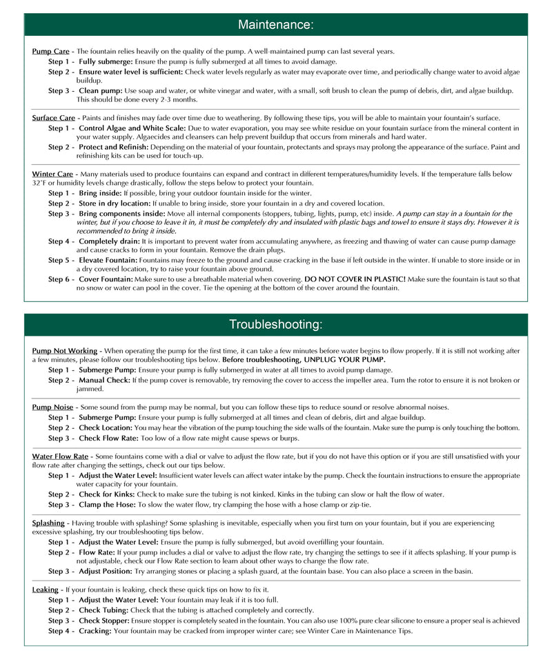 For information on how to winterize your outdoor fountain Click HereFor information on how to remove algae from your fountain Click Here