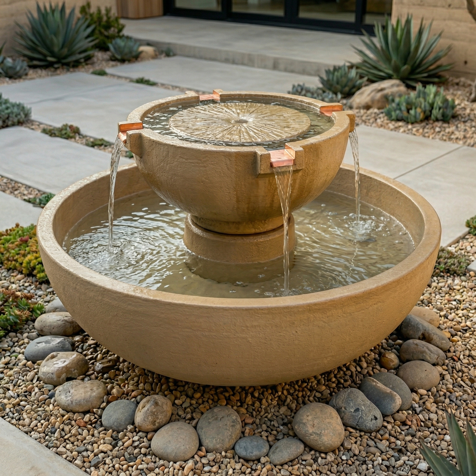 This beautiful fountain is simple enough to fit with any modern decor. It features a two beautiful basin levels of water that overflows and creates a soothing sound of flowing water. This decorative fountain provide beauty to your garden or landscape. It is made of cast stone concrete construction to ensure durability and long last for many years.