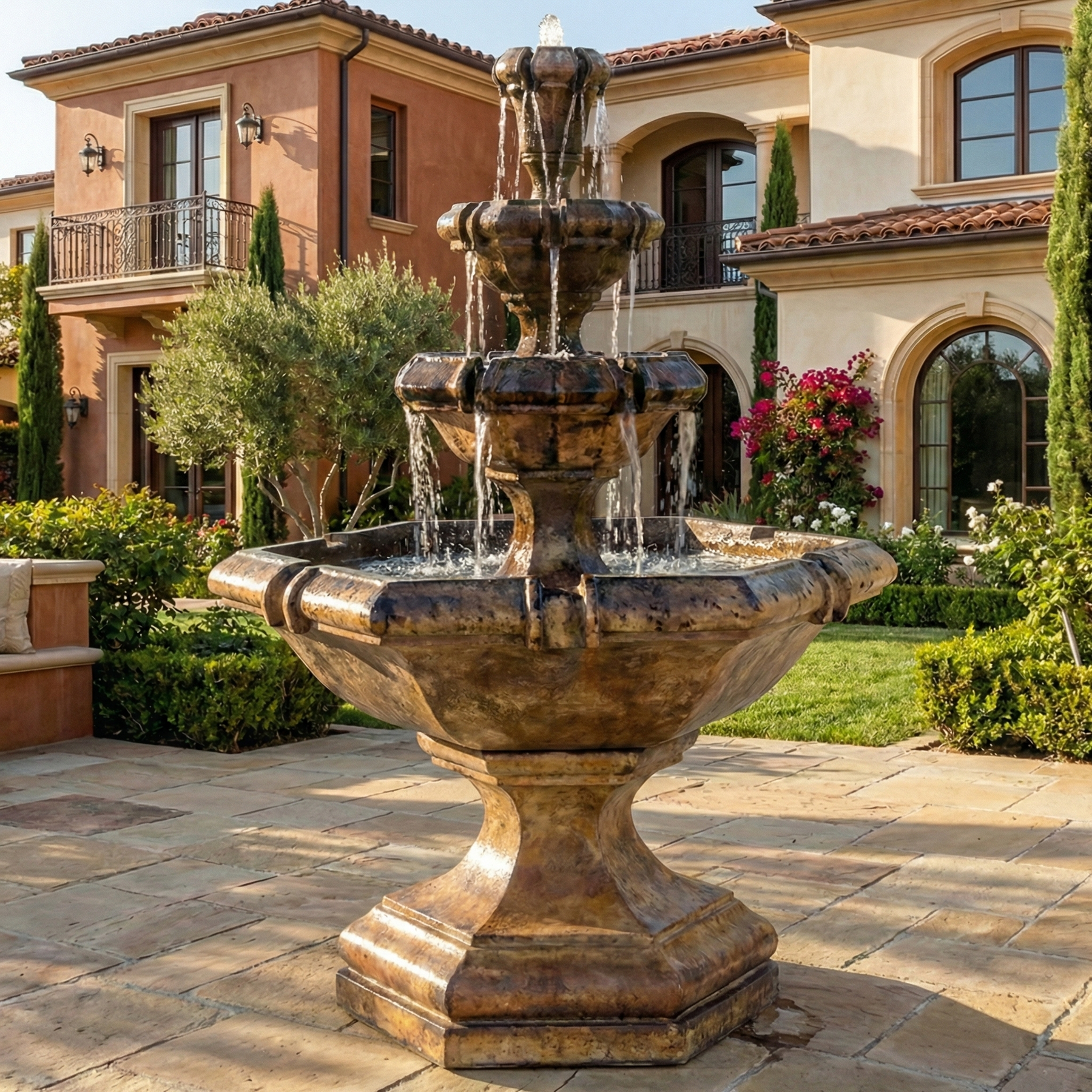 Add a calm ambiance to your outdoor space by adding the Grande Kensington Three Tier Fountain. This water feature is visually stunning and offers calming sounds of moving water.