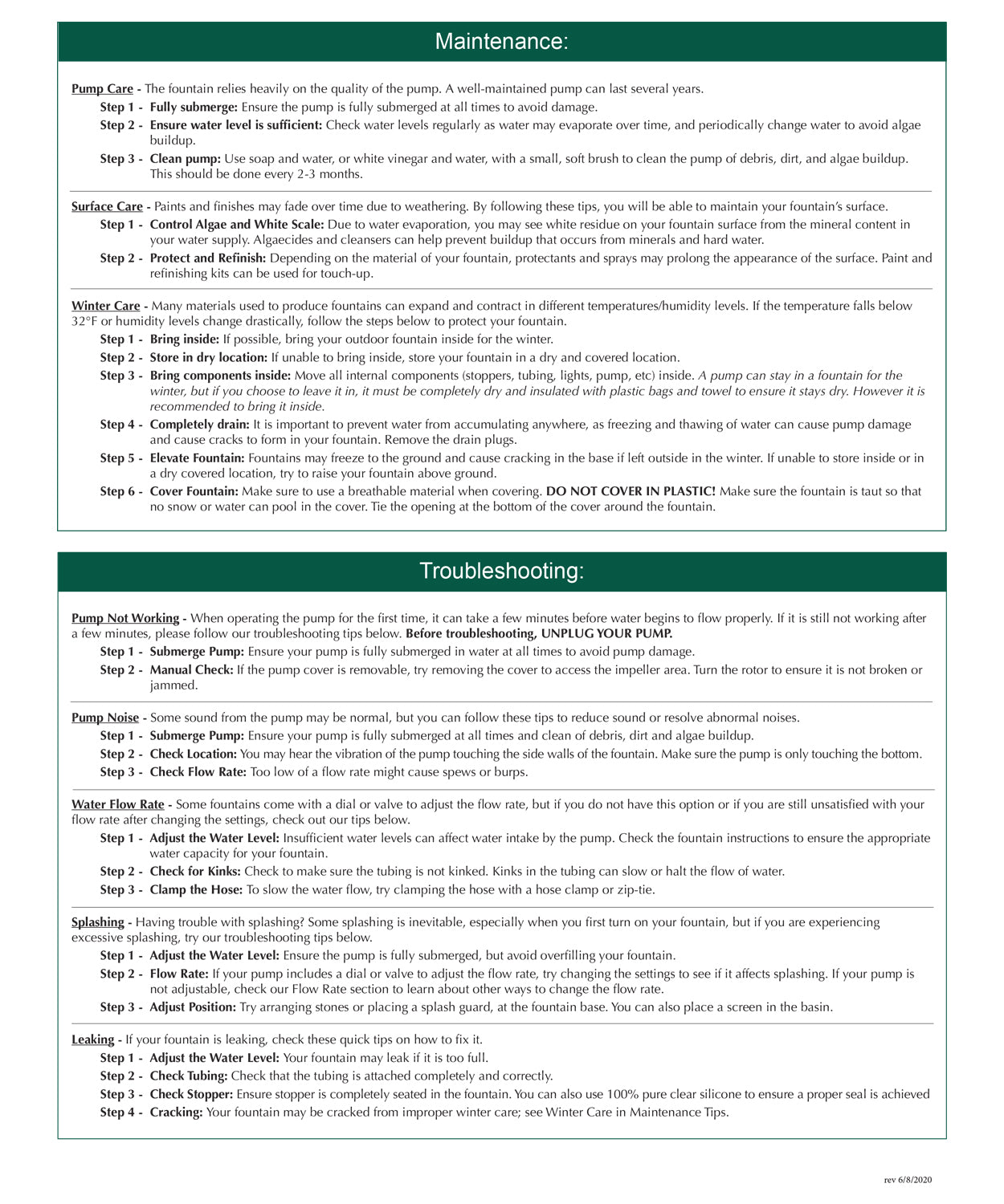 For information on how to winterize your outdoor fountain Click HereFor information on how to remove algae from your fountain Click Here