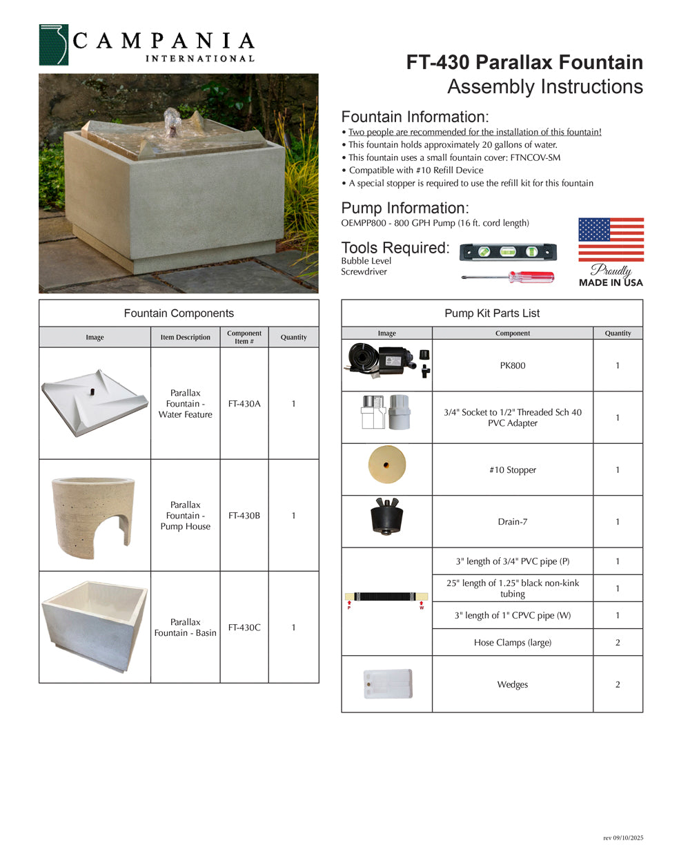 To keep a constant water level in your fountain, you can add the auto refill system. It comes with a float valve, concrete base, custom stopper, clear tubing, and a pressure relief garden hose or spigot connection. The device is connected to a garden hose or spigot, and the water is turned on and off by the valve in the unit, keeping your fountain filled effortlessly.