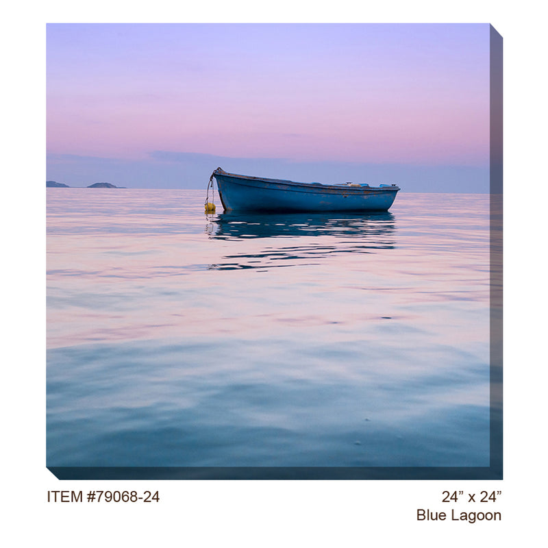 The Blue Lagoon Outdoor Canvas Art features the soft hues of a fiery sunset over still waters. The image is generated from high resolution digital scans and printed with archival quality inks onto canvas. The Giclée printing process lets every color pop off of the canvas. Using the gallery wrap method, the canvas is stretched  so that it wraps around the sides onto the stretcher bars, making the image appear on the sides of the frame as well as the front allowing a frameless presentation of the finished art work. Guaranteed by manufacturer's warranty of two years, these wall arts are tested by two independent laboratories for corrosion, fading and framework durability and passed with exceptional ratings.