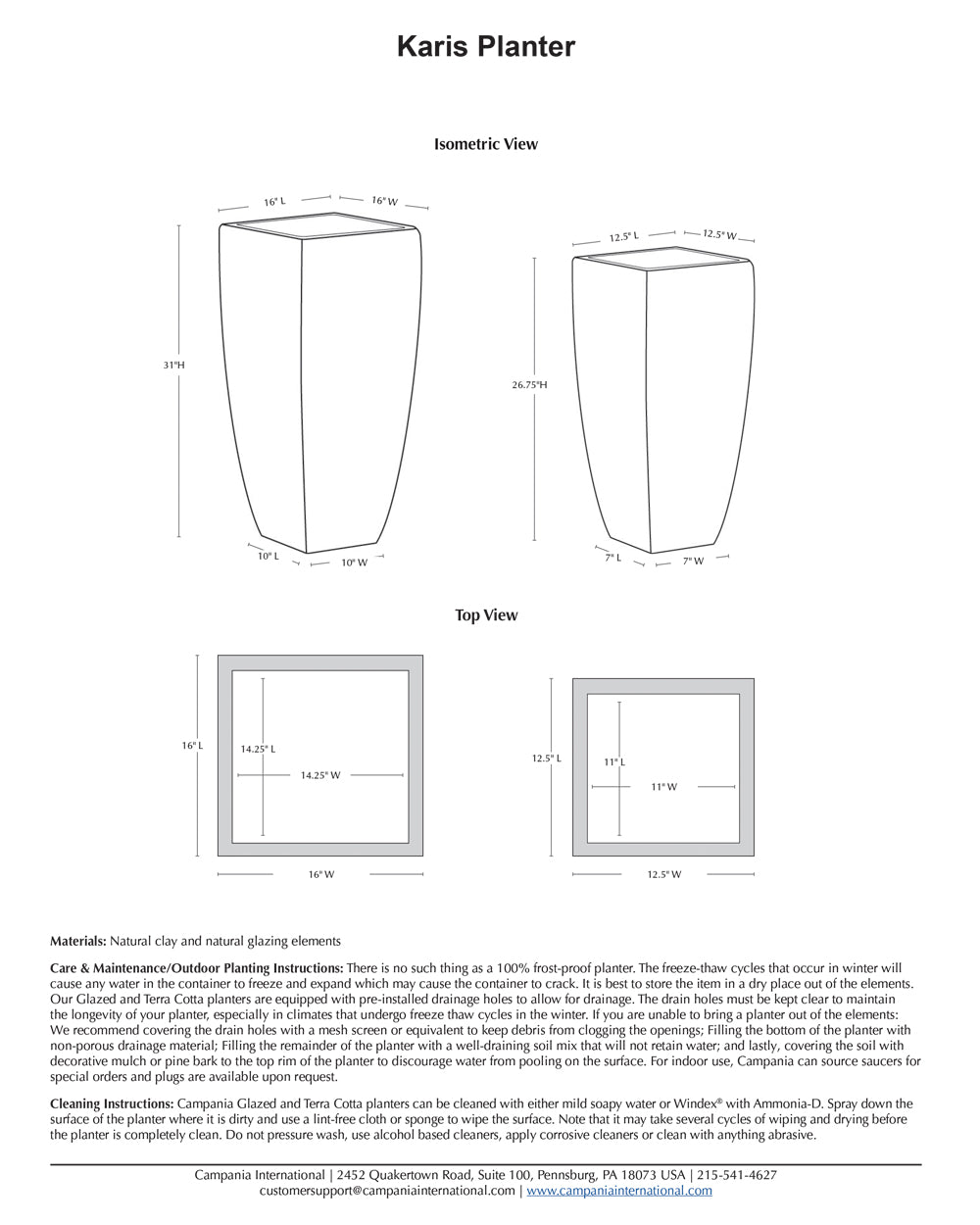 Cleaning Instructions: Campania Glazed and Terra Cotta planters can be cleaned with either mild soapy water or Windex® with Ammonia-D. Spray down the surface of the planter where it is dirty and use a lint-free cloth or sponge to wipe the surface. Note that it may take several cycles of wiping and drying before the planter is completely clean. Do not pressure wash, use alcohol based cleaners, apply corrosive cleaners or clean with anything abrasive.
