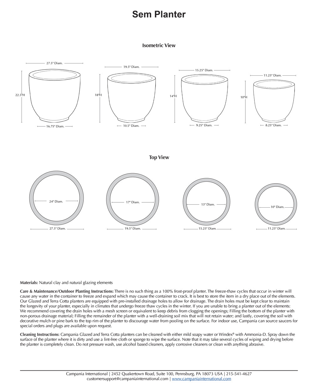 Cleaning Instructions: Campania Glazed and Terra Cotta planters can be cleaned with either mild soapy water or Windex® with Ammonia-D. Spray down the surface of the planter where it is dirty and use a lint-free cloth or sponge to wipe the surface. Note that it may take several cycles of wiping and drying before the planter is completely clean. Do not pressure wash, use alcohol based cleaners, apply corrosive cleaners or clean with anything abrasive.