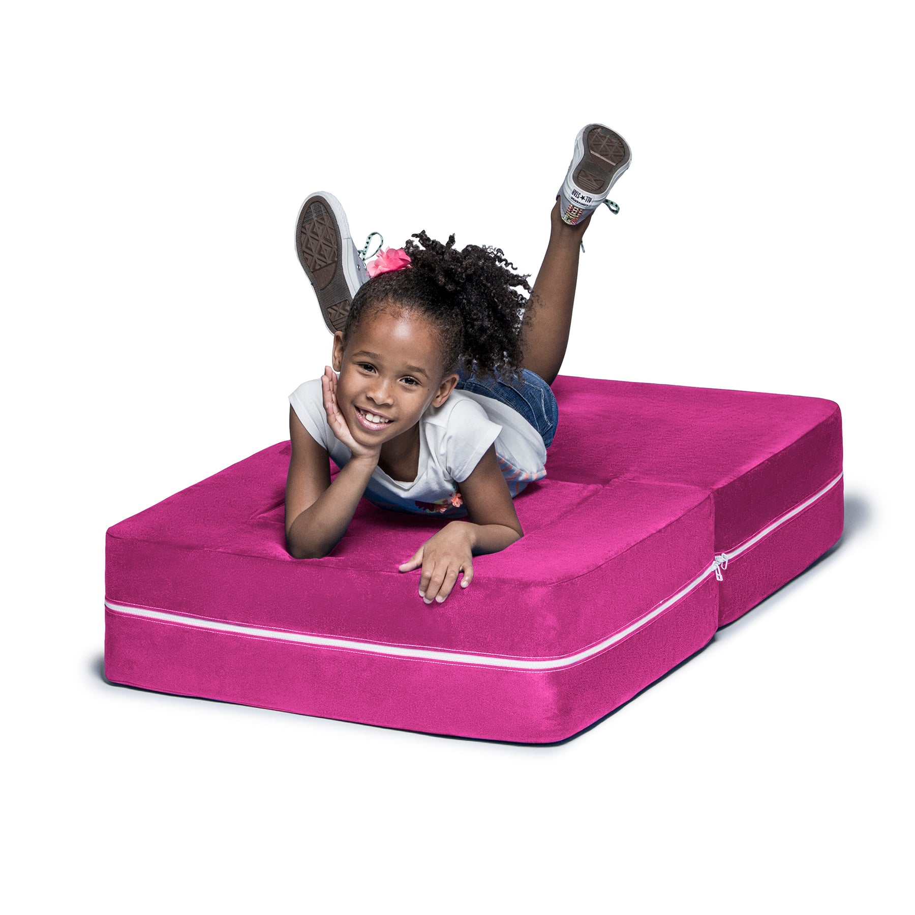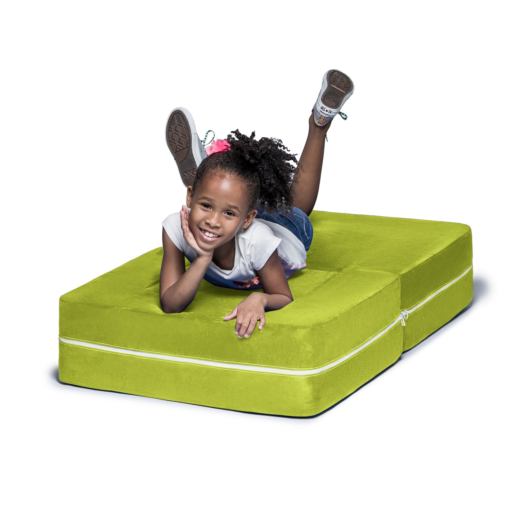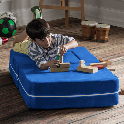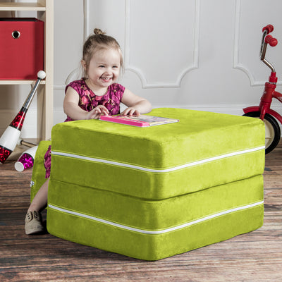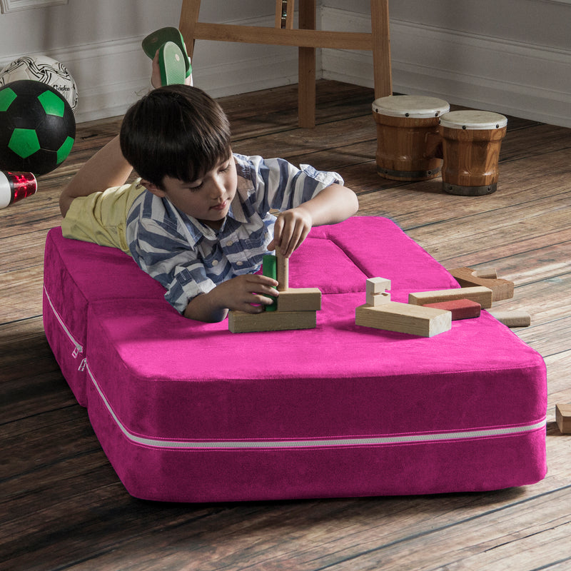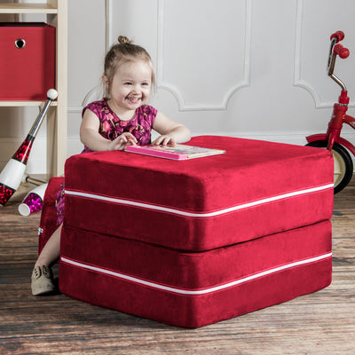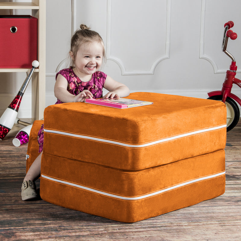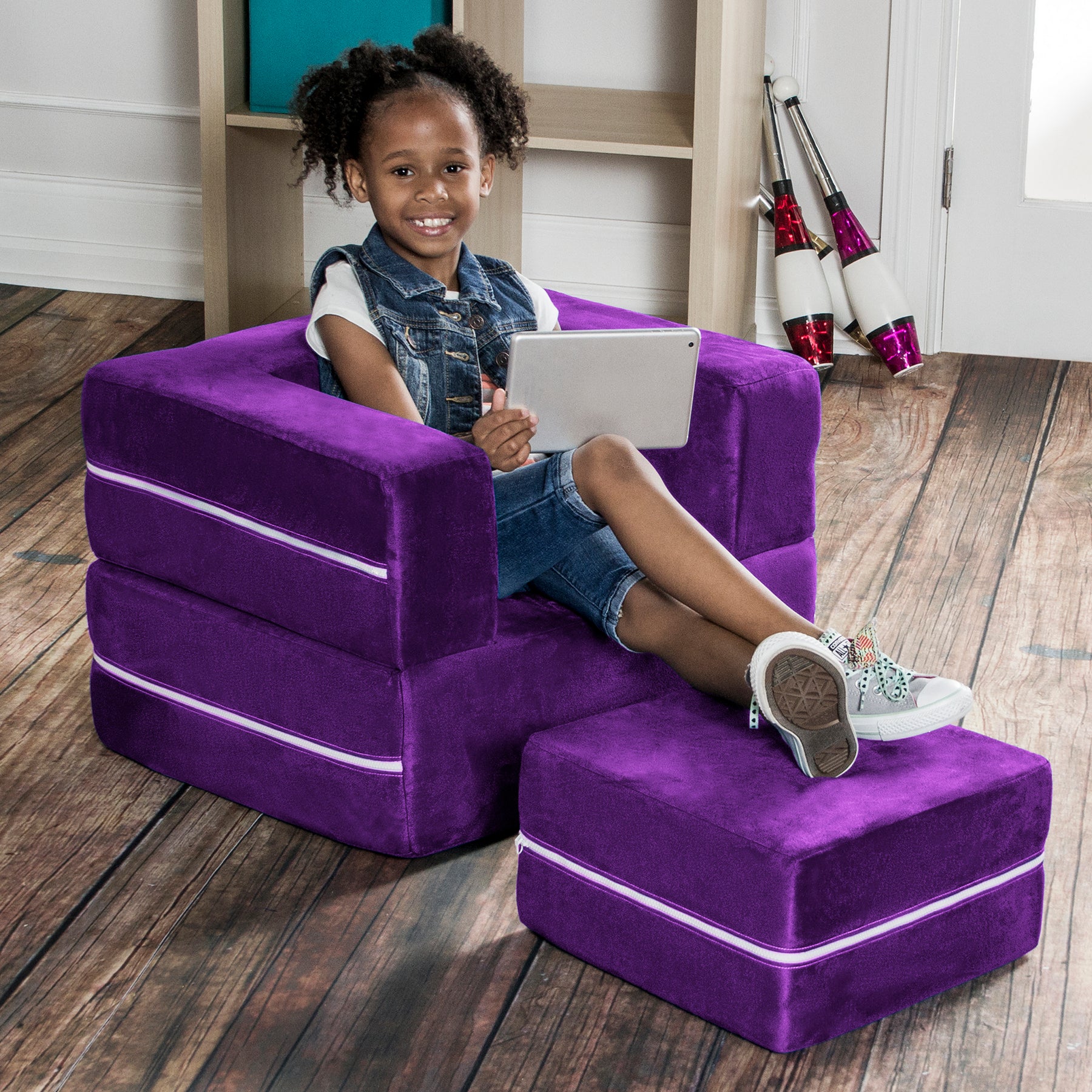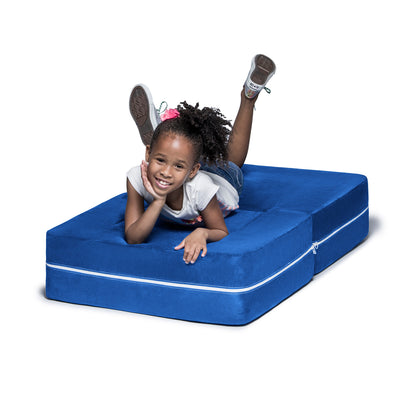 Filled with comfortable and highly durable polyurethane foam and covered in vividly colored removable, machine-washable soft faux suede, the Jaxx Zipline Modular Kids Chair & Ottoman / Fold-Out Lounger is an innovative kid-sized chair. It features an easy fold out design that can convert it into a lounging or gaming platform. Shipped in compressed packaging to reduce shipping costs and our environmental impact. Made in Atlanta with pride.