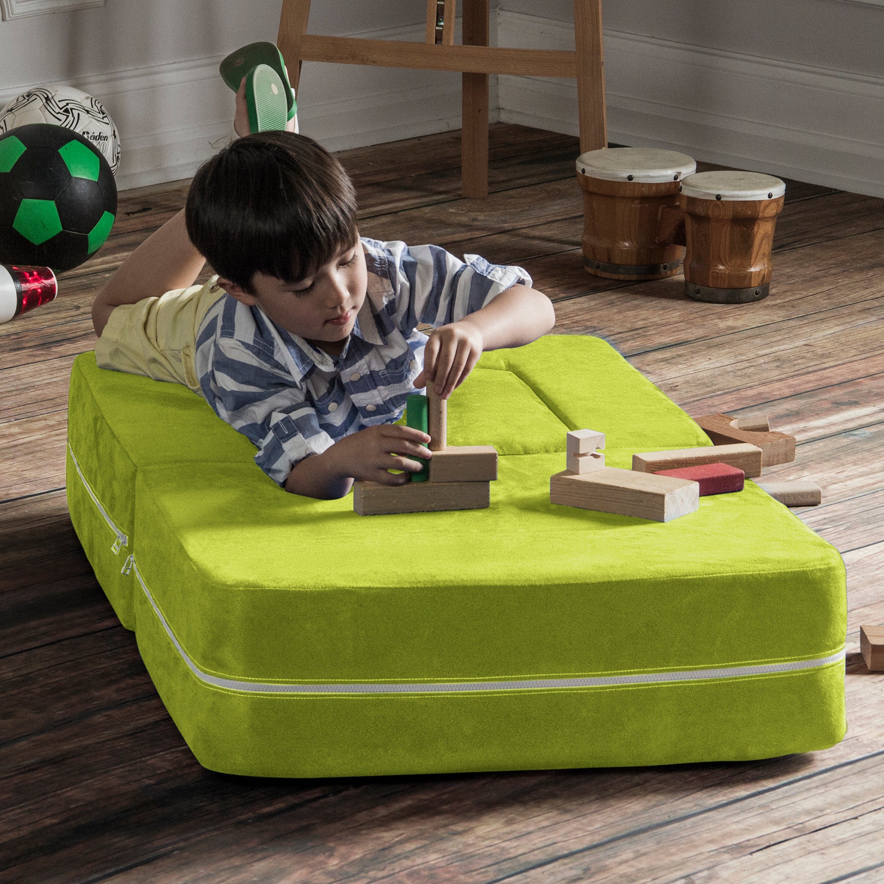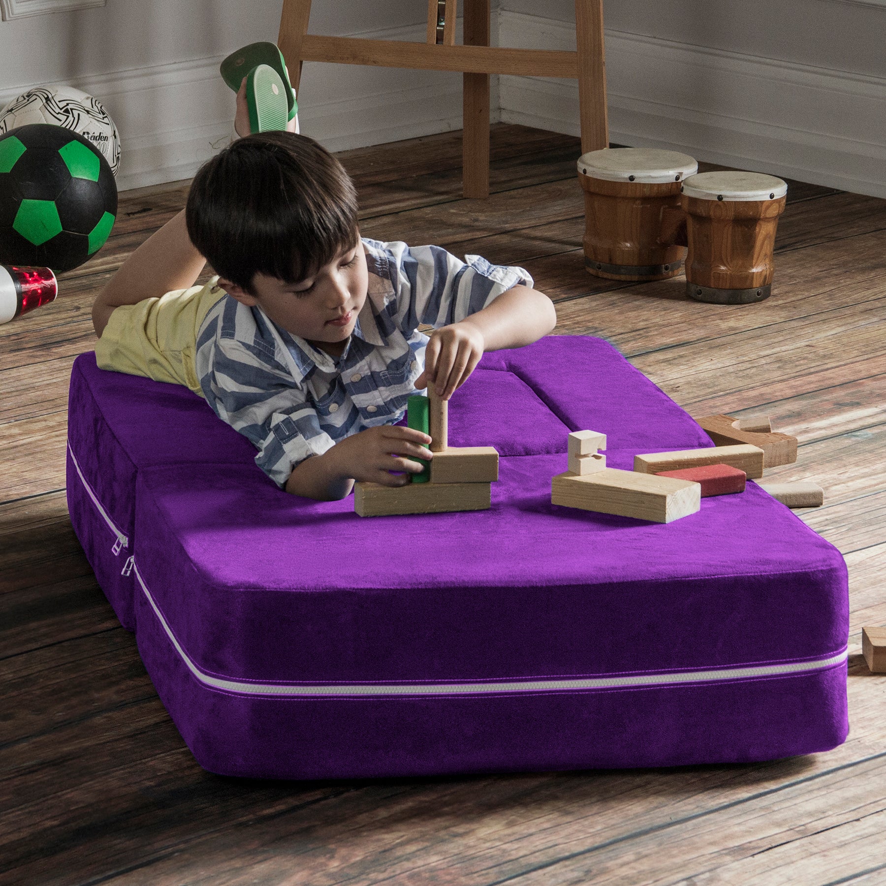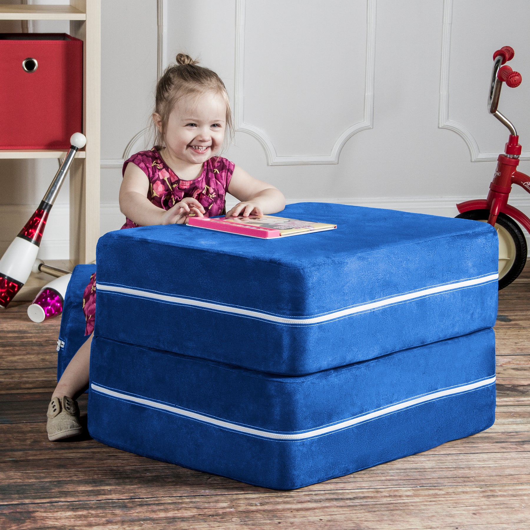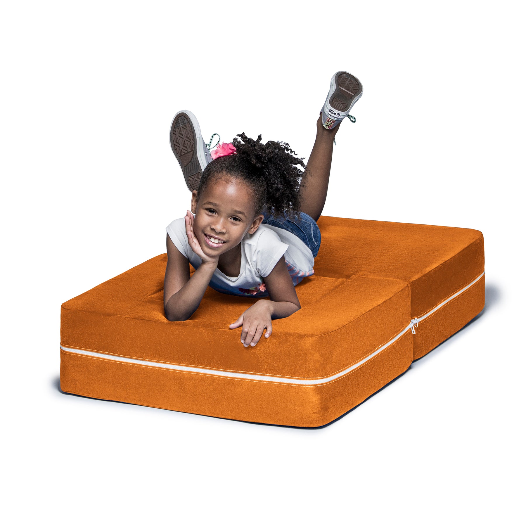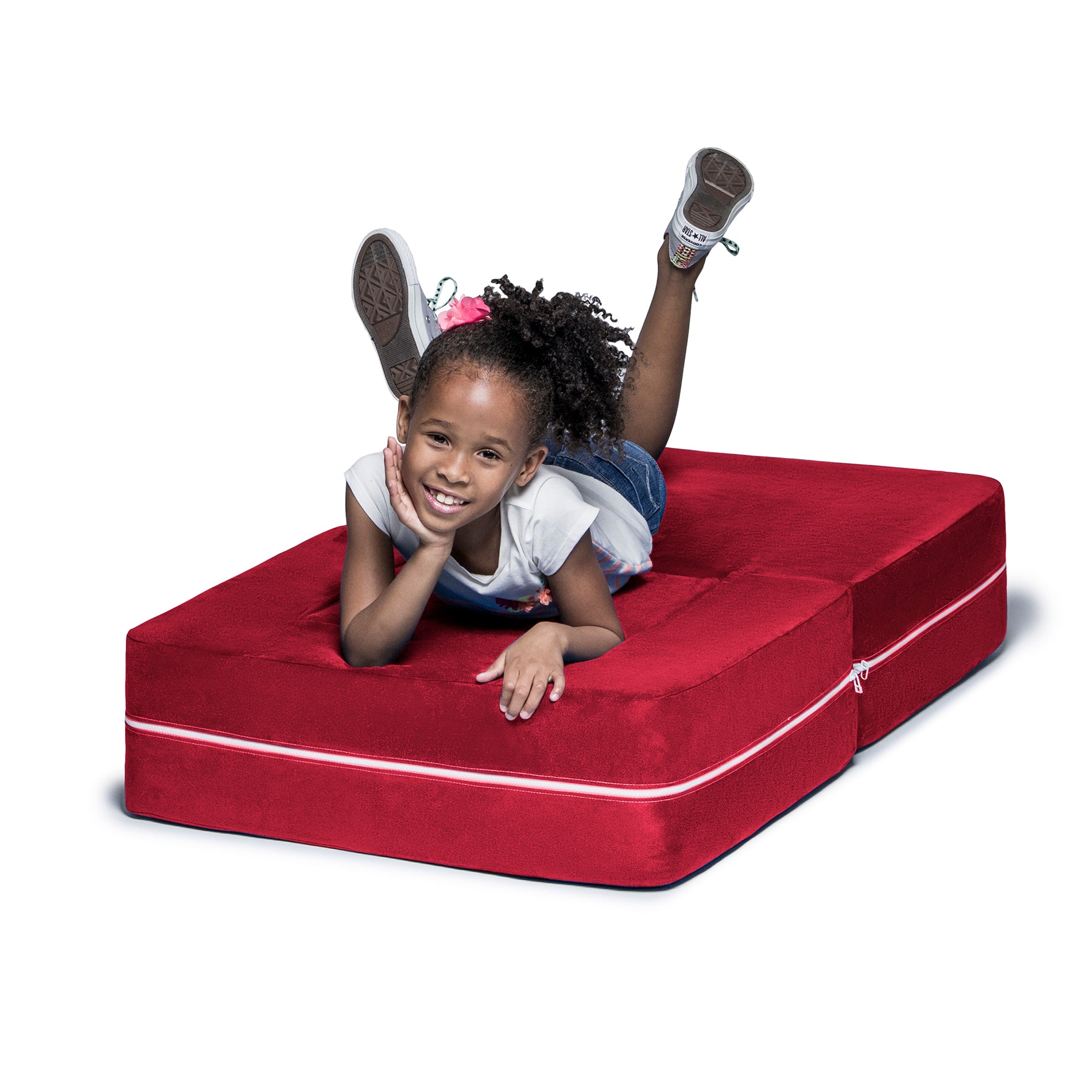 Filled with comfortable and highly durable polyurethane foam and covered in vividly colored removable, machine-washable soft faux suede, the Jaxx Zipline Modular Kids Chair & Ottoman / Fold-Out Lounger is an innovative kid-sized chair. It features an easy fold out design that can convert it into a lounging or gaming platform. Shipped in compressed packaging to reduce shipping costs and our environmental impact. Made in Atlanta with pride.