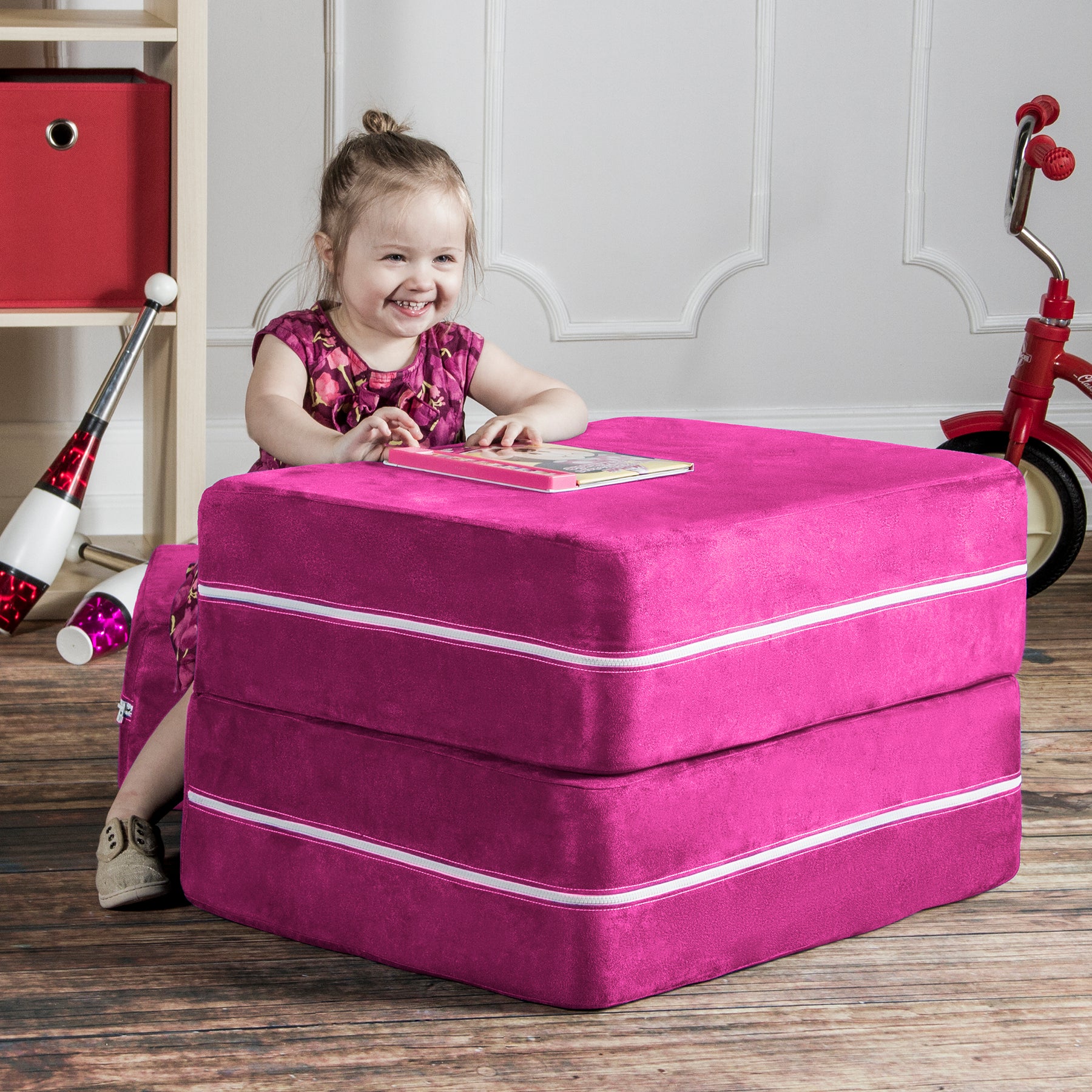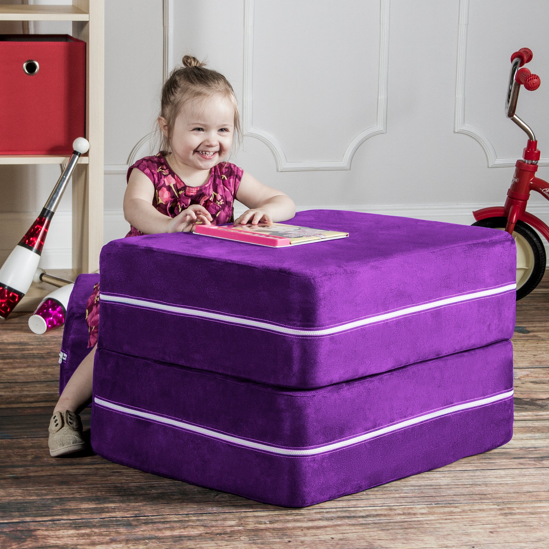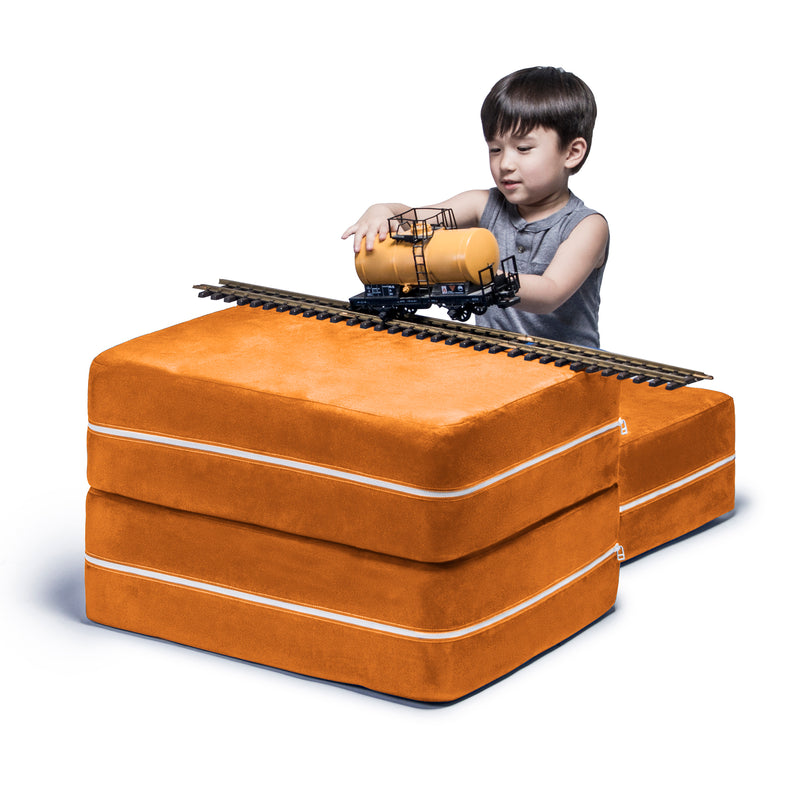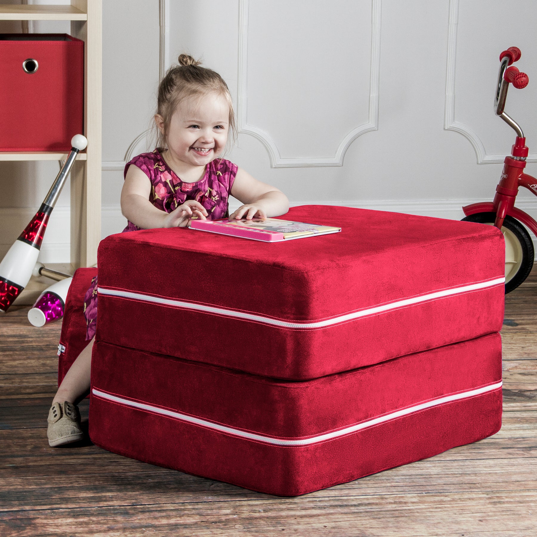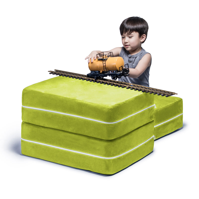 • Innovative modular kids chair with matching ottoman that easily converts into a lounging platform or play table