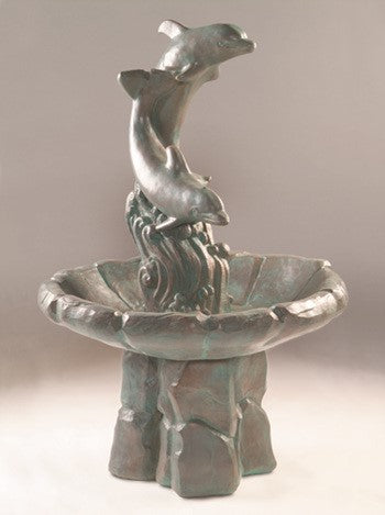This charming cast stone fountain will add a modern look to your garden or patio. It features a natural grace and beauty of dolphins riding a stylized wave atop a lovely fountain basin. Create a peaceful, meditative atmosphere with natural style of dolphin fountains in any outdoor settings.