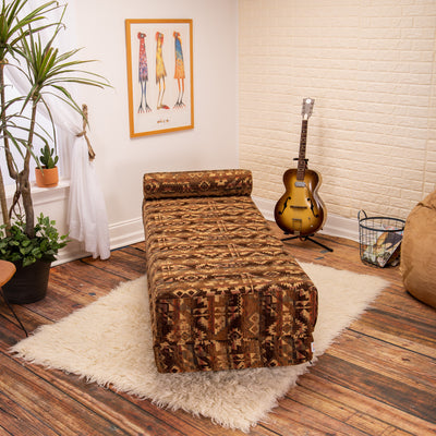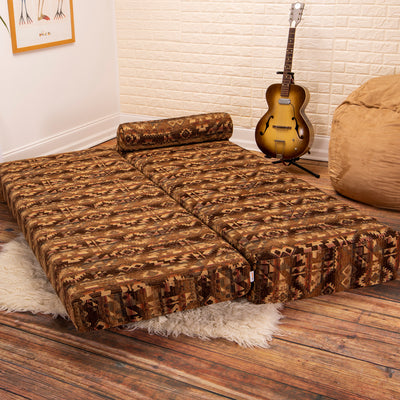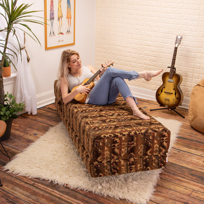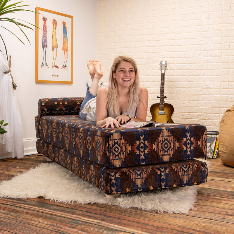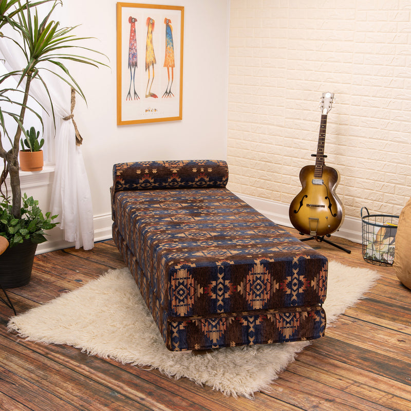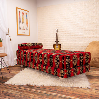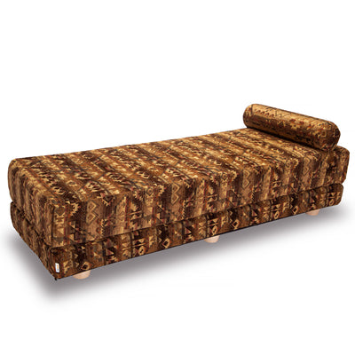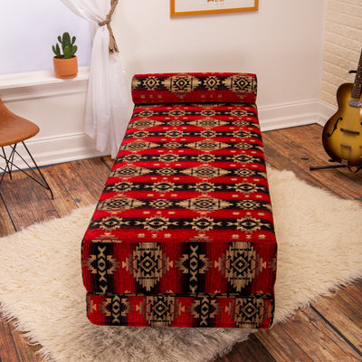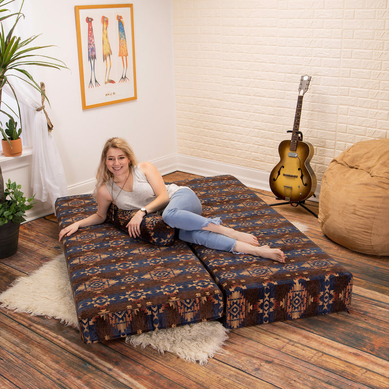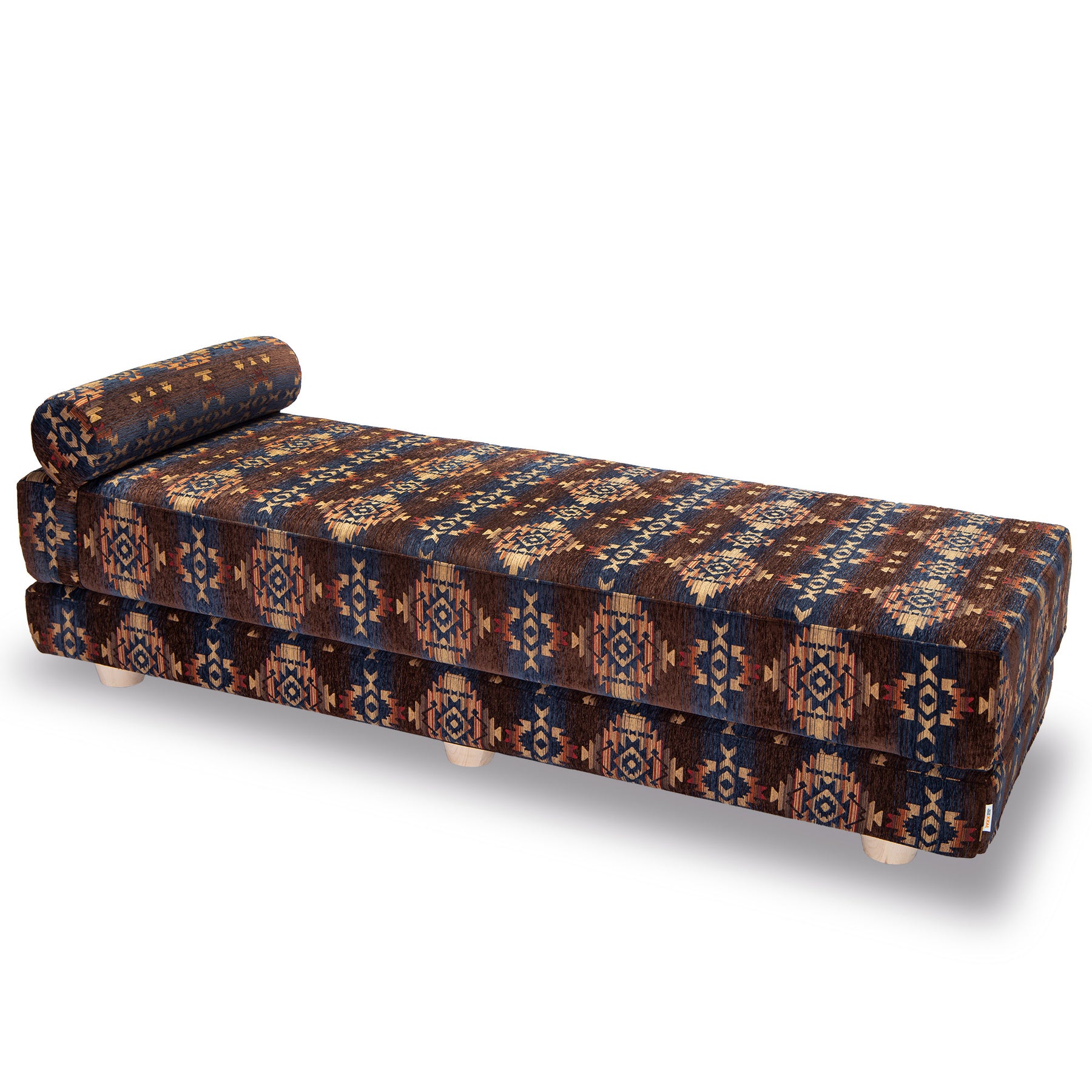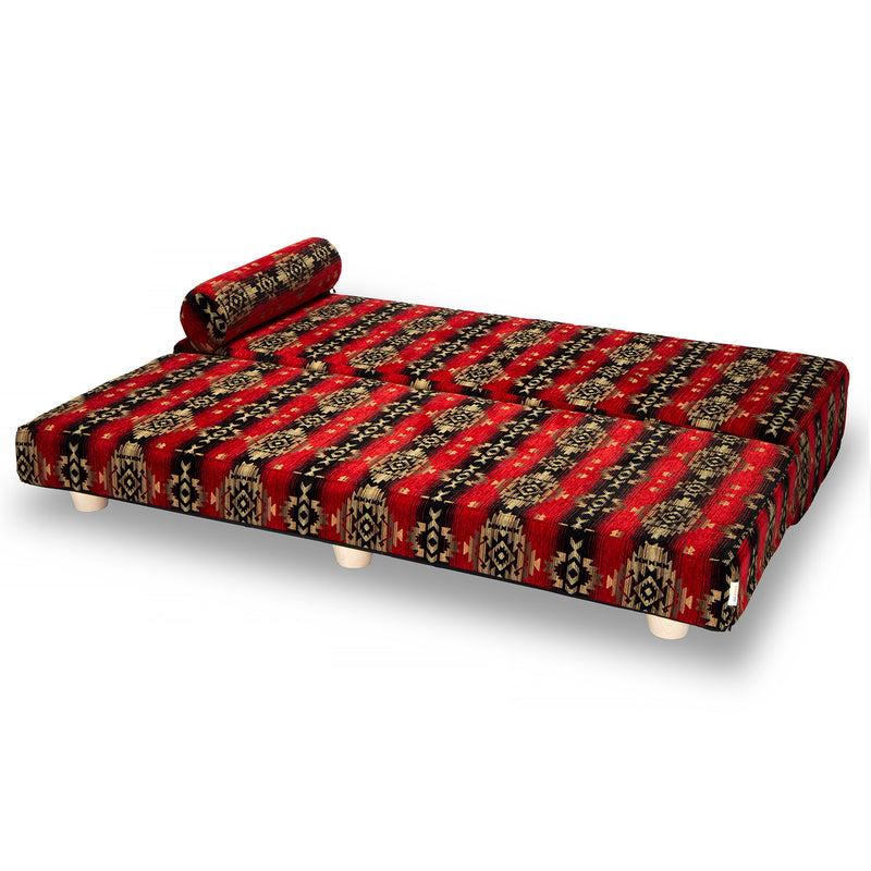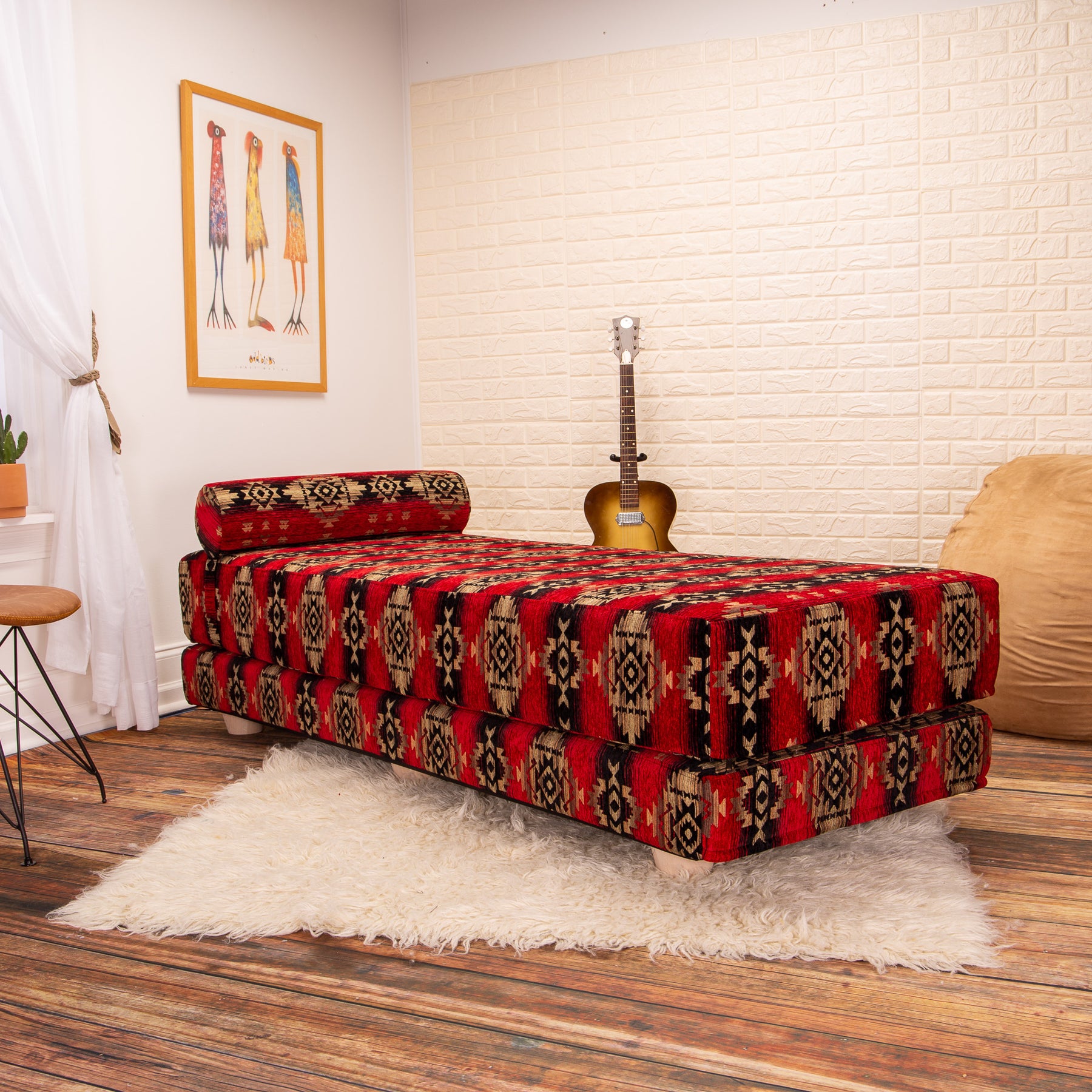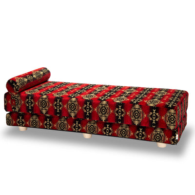 The Alon Santa Fe daybed combines the beauty and charm of the American Southwest with a modern, rustic-chic appeal. Crafted with a pair of foam platforms and covered with a premium southwestern-inspired woven fabric, the Alon Daybed Santa Fe acts as a cozy chaise lounge when stacked, and doubles as a queen-size platform when placed side by side. This design is elevated with beautiful hand-crafted maple legs that can be secured in seconds to the easy-to-assemble internal wooden frame. The repositionable, removable bolster is an added bonus that not only complements the Alon Santa Fe’s streamlined design but also serves as an armrest or pillow that can be removed, thanks to its flexible elastic strap. The Alon Santa Fe daybed is available in three gorgeous washable woven fabrics that include vibrant red and black, sultry blue and brown, and an earthy tan and brown, each accented with a warm gold tone to create a true rustic western elegance for any setting. Beneath these washable covers are layers of body supporting satisfaction by means of high-density polyurethane foam and a supple comfort foam top layer.