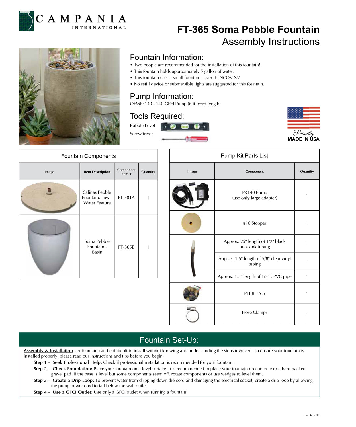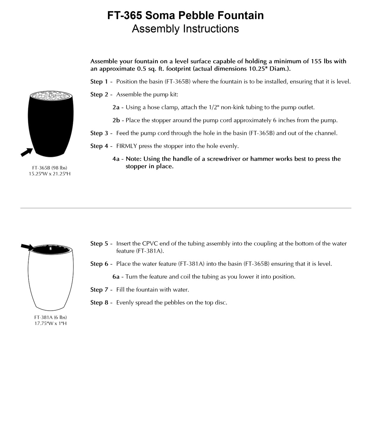 - All hardware and tubing required to properly assemble the fountain