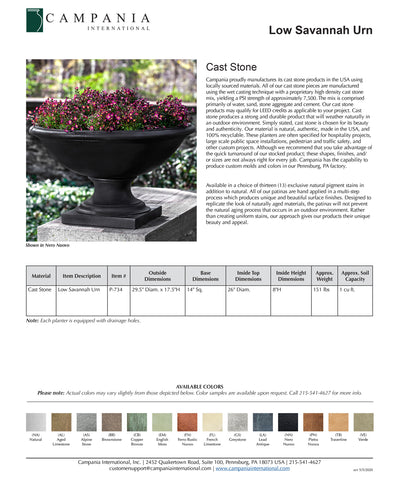 Campania proudly manufactures its cast stone products in the USA using locally sourced materials. All of our cast stone pieces are manufactured using the wet casting technique with a proprietary high density cast stone mix, yielding a PSI strength of approximately 7,500. The mix is comprised primarily of water, sand, stone aggregate and cement. Our cast stone products may qualify for LEED credits as applicable to your project. Cast stone produces a strong and durable product that will weather naturally in an outdoor environment. Simply stated, cast stone is chosen for its beauty and authenticity. Our material is natural, authentic, made in the USA, and 100% recyclable.