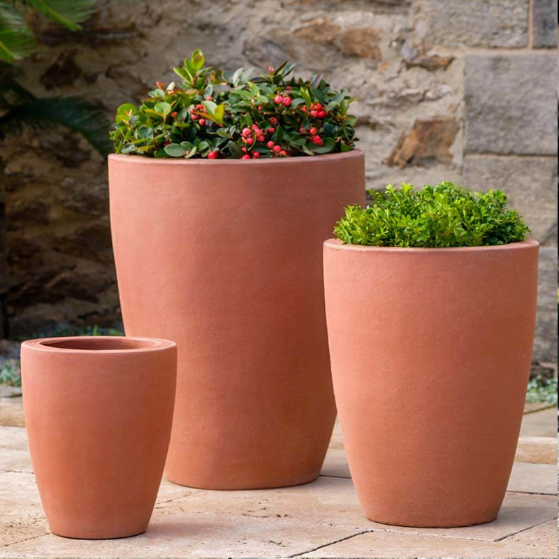 We recommend covering the drain holes with a mesh screen or equivalent to keep debris from clogging the openings; Filling the bottom of the planter with non-porous drainage material; Filling the remainder of the planter with a well-draining soil mix that will not retain water; and lastly, covering the soil with decorative mulch or pine bark to the top rim of the planter to discourage water from pooling on the surface. For indoor use, Campania can source saucers for special orders and plugs are available upon request.
