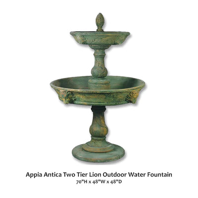 Add a classic flair to your outdoor setting with the Appia Antica Two Tier Lion Outdoor Water Fountain. This fountain has a nice antique look featuring an egg-shaped finial and two tiers with detailed lion heads accent.